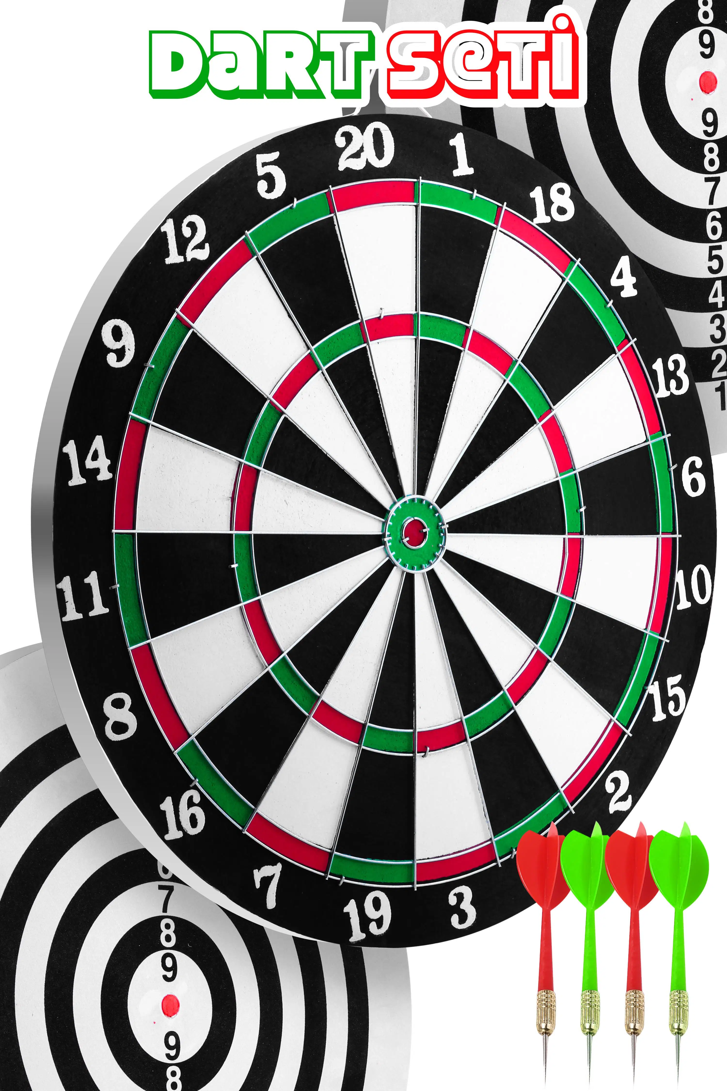 * **1 Adet Çift Taraflı Dart Tahtası:** 30 cm çapındaki tahta, hem amatör turnuva boyutlarına uygun hem de evde keyifle oynayabileceğiniz ideal bir boyuta sahip. Bir tarafı klasik dart oyunu için tasarlanırken, diğer tarafı size farklı bir oyun deneyimi sunan "Hedef Tahtası" şeklindedir.