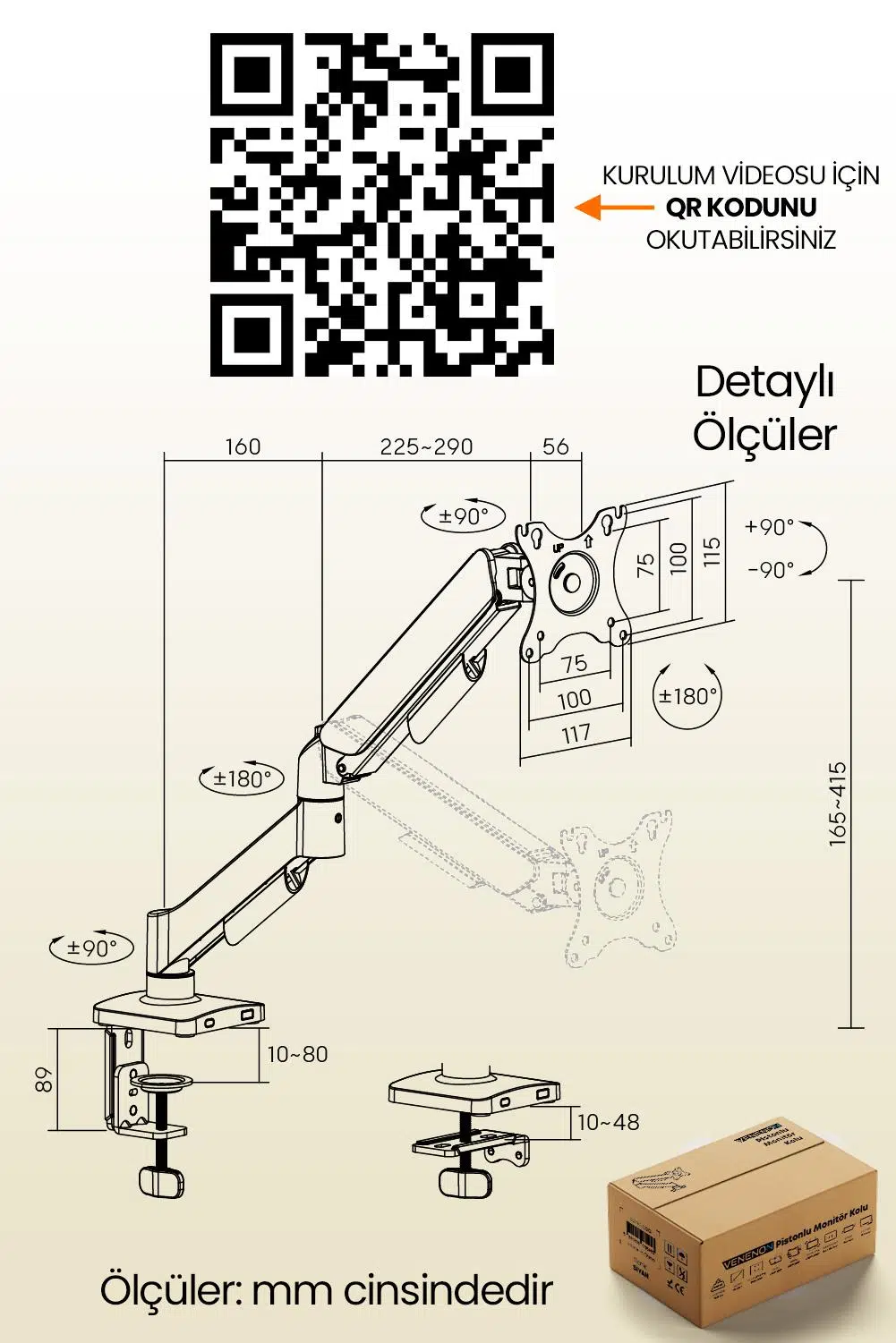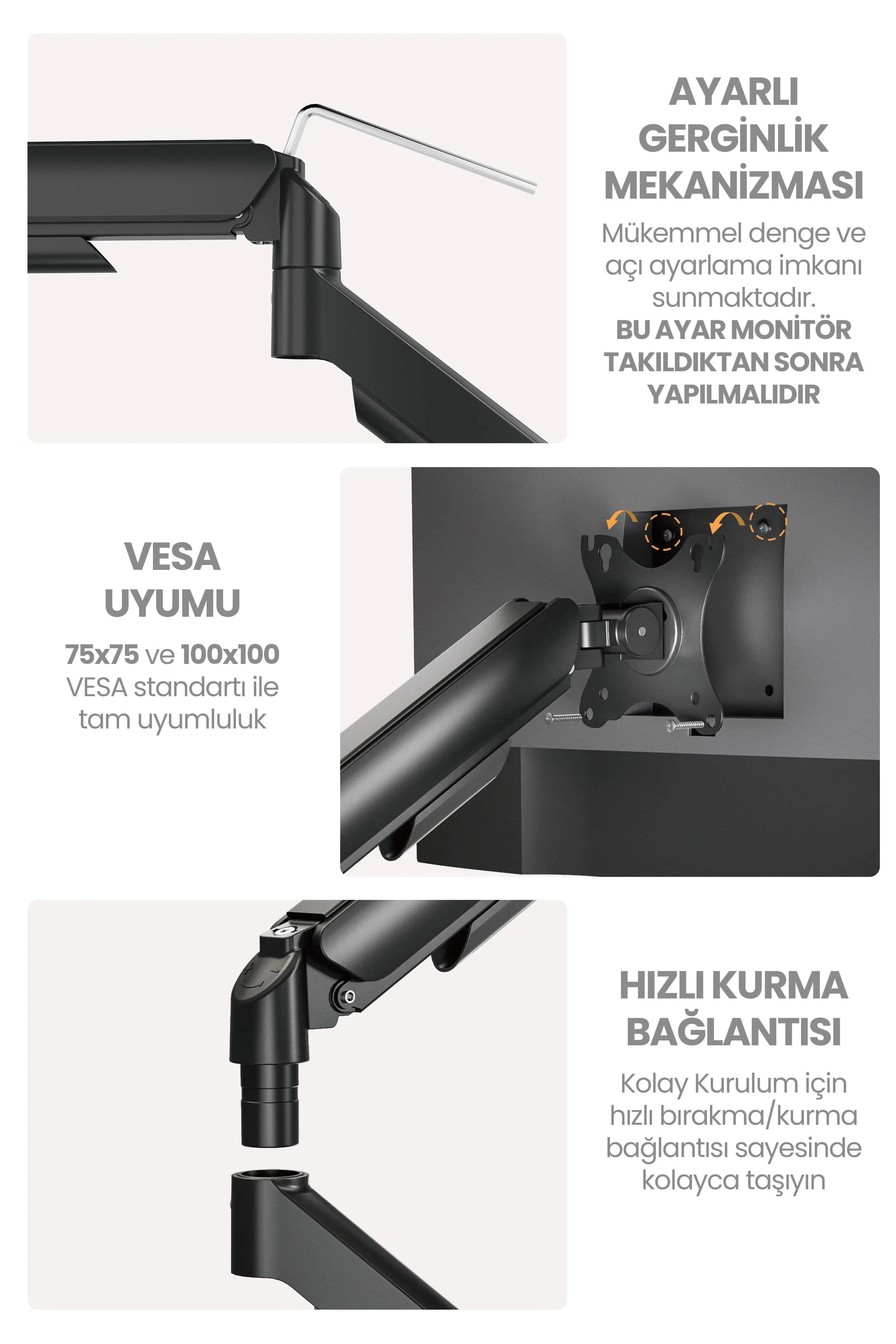 Ayarlı Gerginlik Mekanizması: Monitör takıldıktan sonra dengeyi hassas ayarlama (ekran “düşme/kalkma” yapmaz)