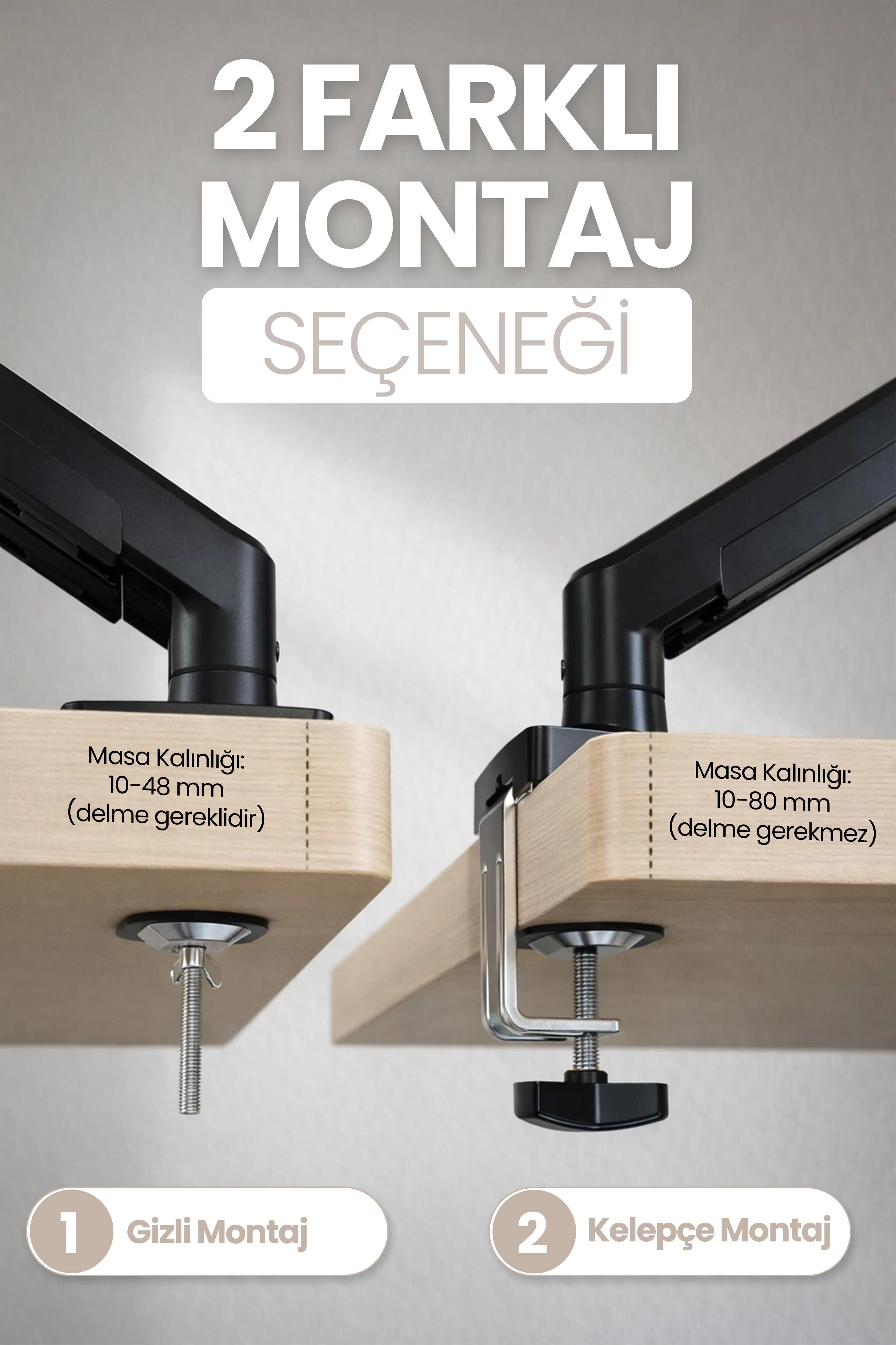 Daha “gizli/temiz” bir görünüm isterseniz gizli montaj seçeneği ile masa üzerinden sabitleme yapabilirsiniz.