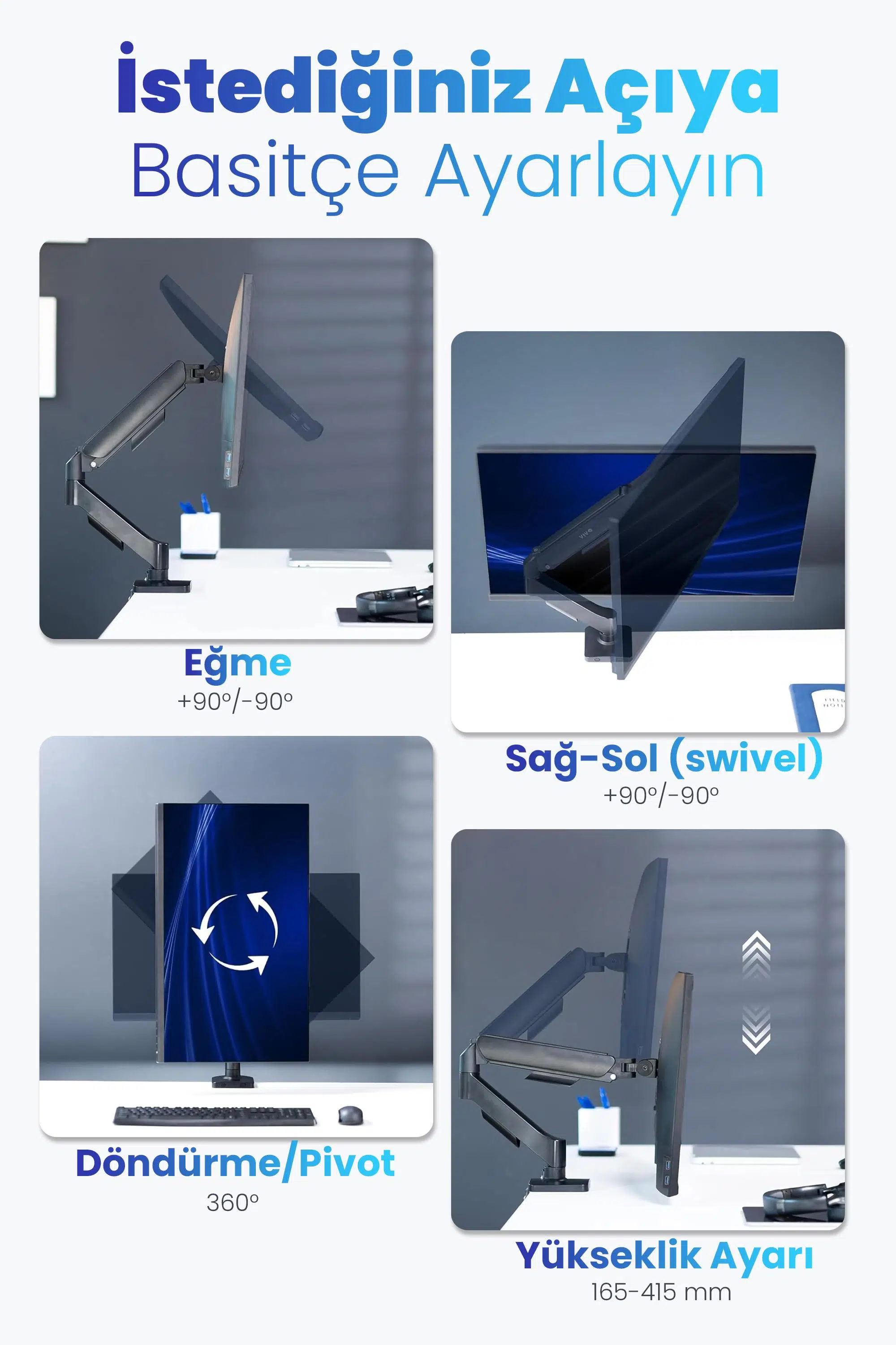 Ayarlı gerginlik mekanizması sayesinde kolun kaldırma kuvveti monitör ağırlığınıza göre ayarlanır. Böylece ekran, ayarladığınız konumda sabit kalır. Ayrıca pivot (dikey/yatay) kullanım, kod yazma, doküman okuma, tasarım ve dikey içerik üretimi için ciddi avantaj sağlar.