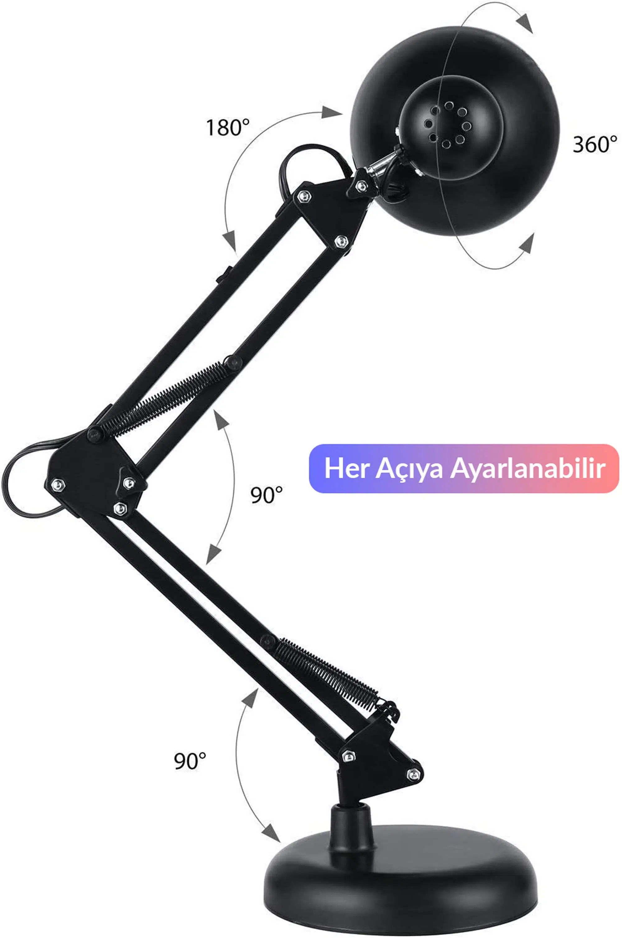 Her açıya ayarlanabilir: 360° dönebilen lamba başlığı ve 180°/90° hareketli kollar ile ışığı dilediğiniz yöne çevirin.