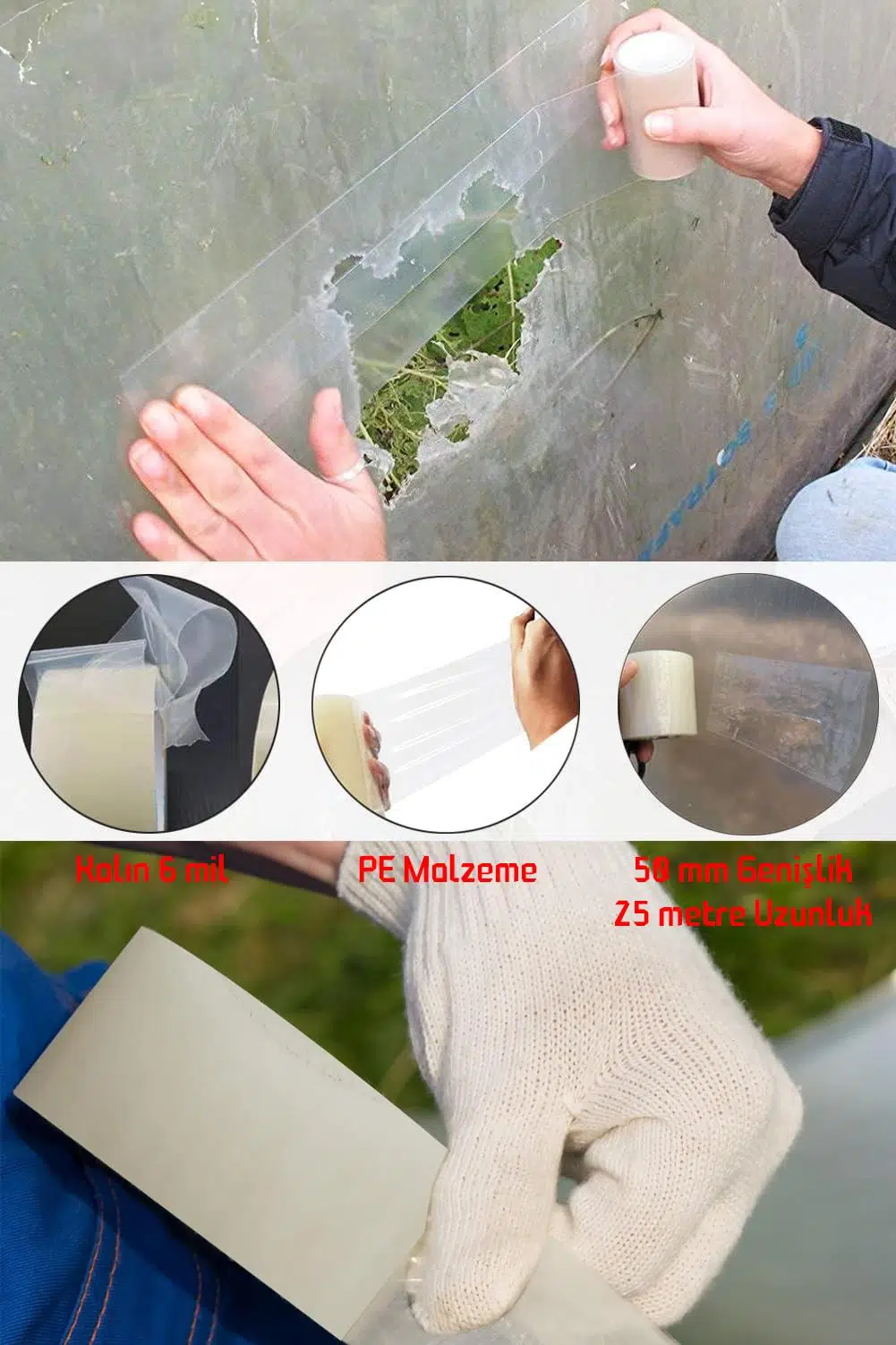 Yırtılan sera naylonunun tamirinde yama ve yapıştırma işleminde kullanılır. PE filmle yalıtım veya yanma uygulamaları ve SERALARIN tamiri gibi çeşitli uygulamalar için ideal bir üründür. Bant aynı zamanda geri dönüşümün çok önemli olduğu ambalajlama uygulamalarında da kullanılabilir. Basınca duyarlı akrilik bazlı yapışkan kaplı saydam, birinci sınıf bir PE banttır. Halojen olmayan bu bant kimyasal maddelere olduğu kadar UV ışınlarına karşıda mükemmel derecede dirençli olduğu için genel kapsamlı bir kullanım alanına sahiptir.