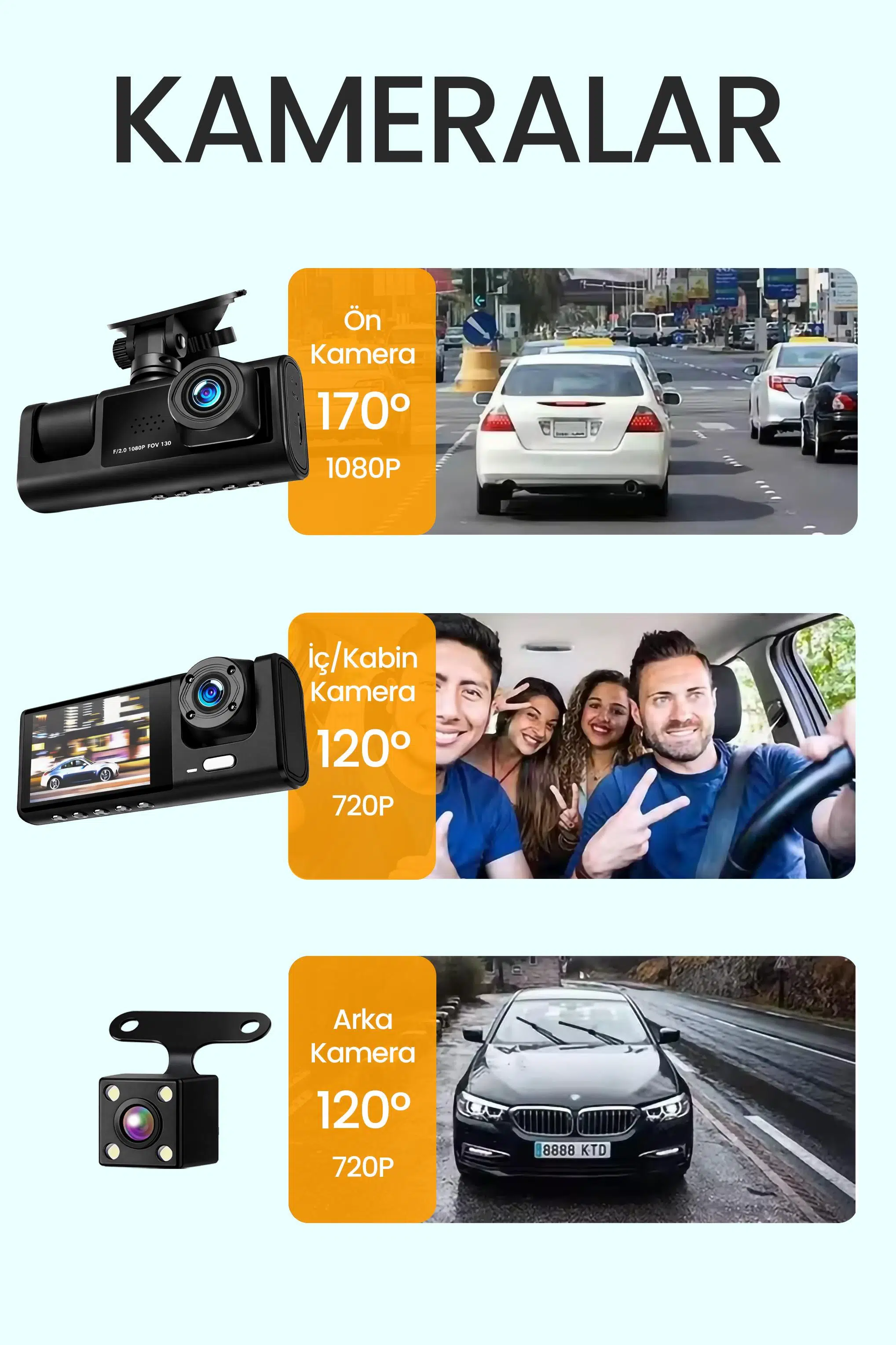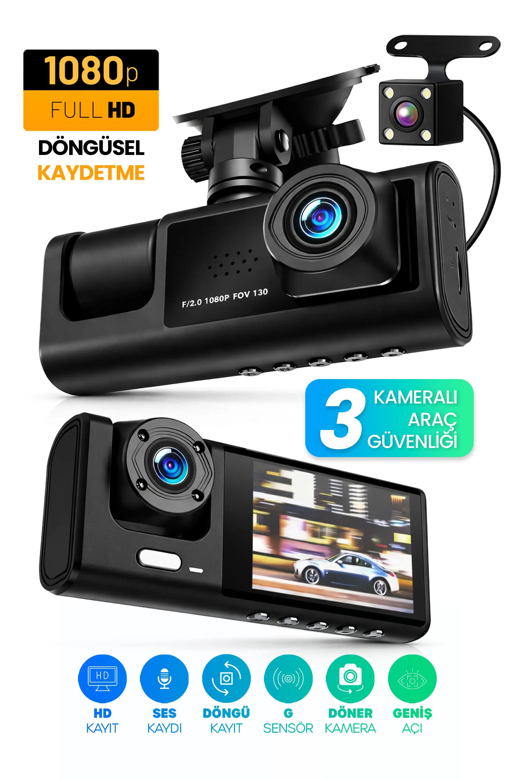 3 Kameralı Kayıt: Ön + İç/Kabin + Arka kamera ile çok açılı kayıt