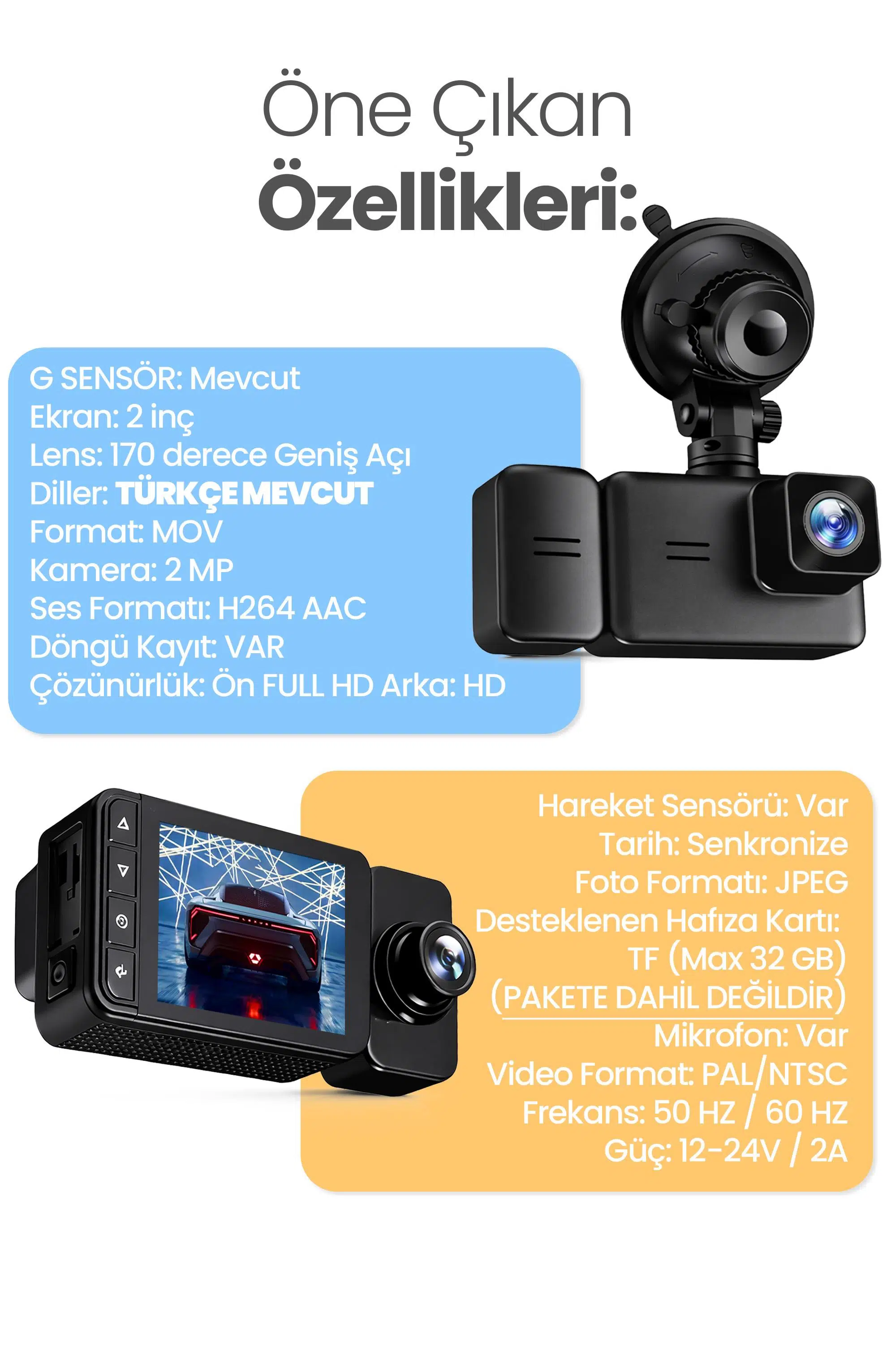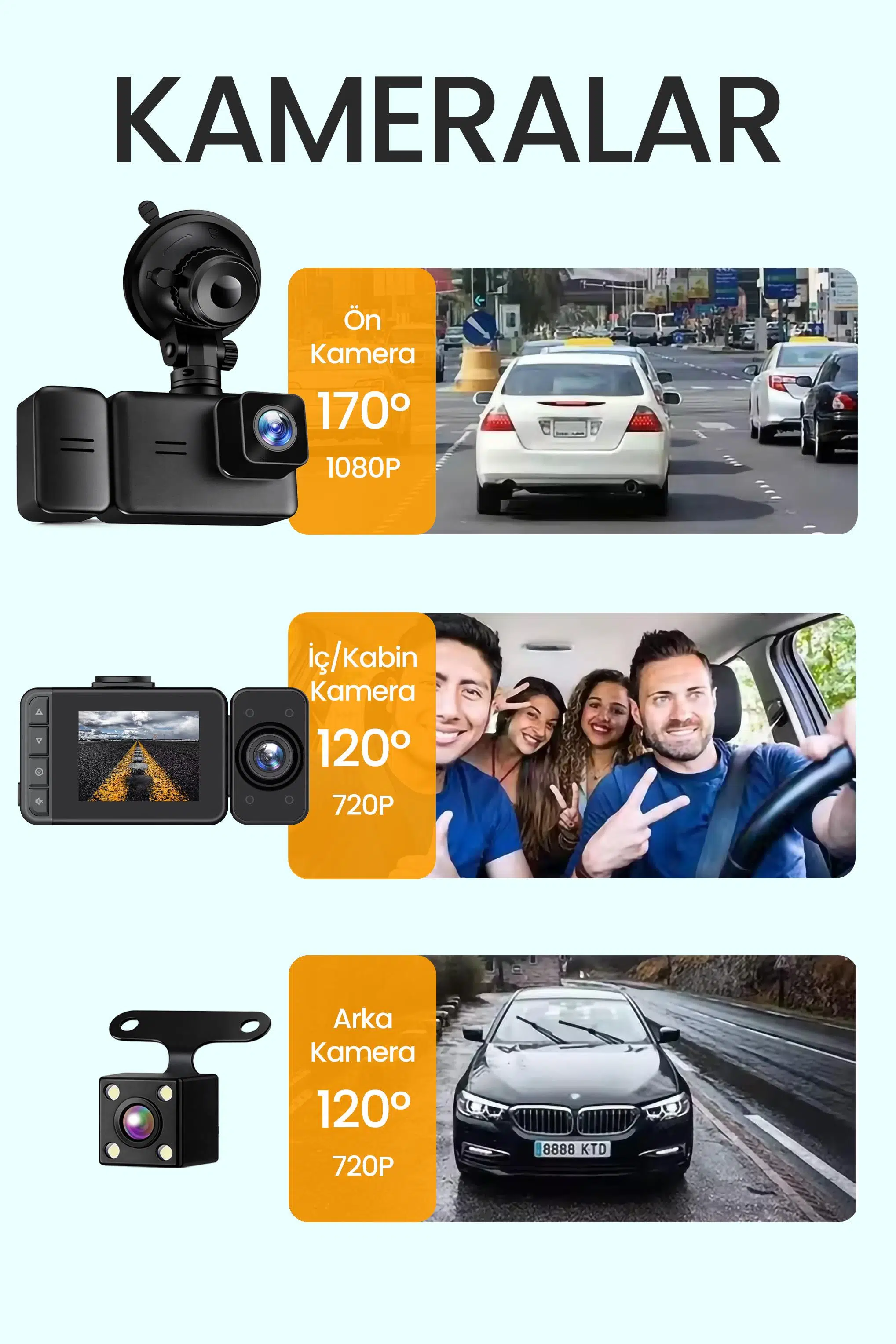 3 Kameralı Kayıt: Ön + iç/kabin + arka açıdan eş zamanlı kayıt