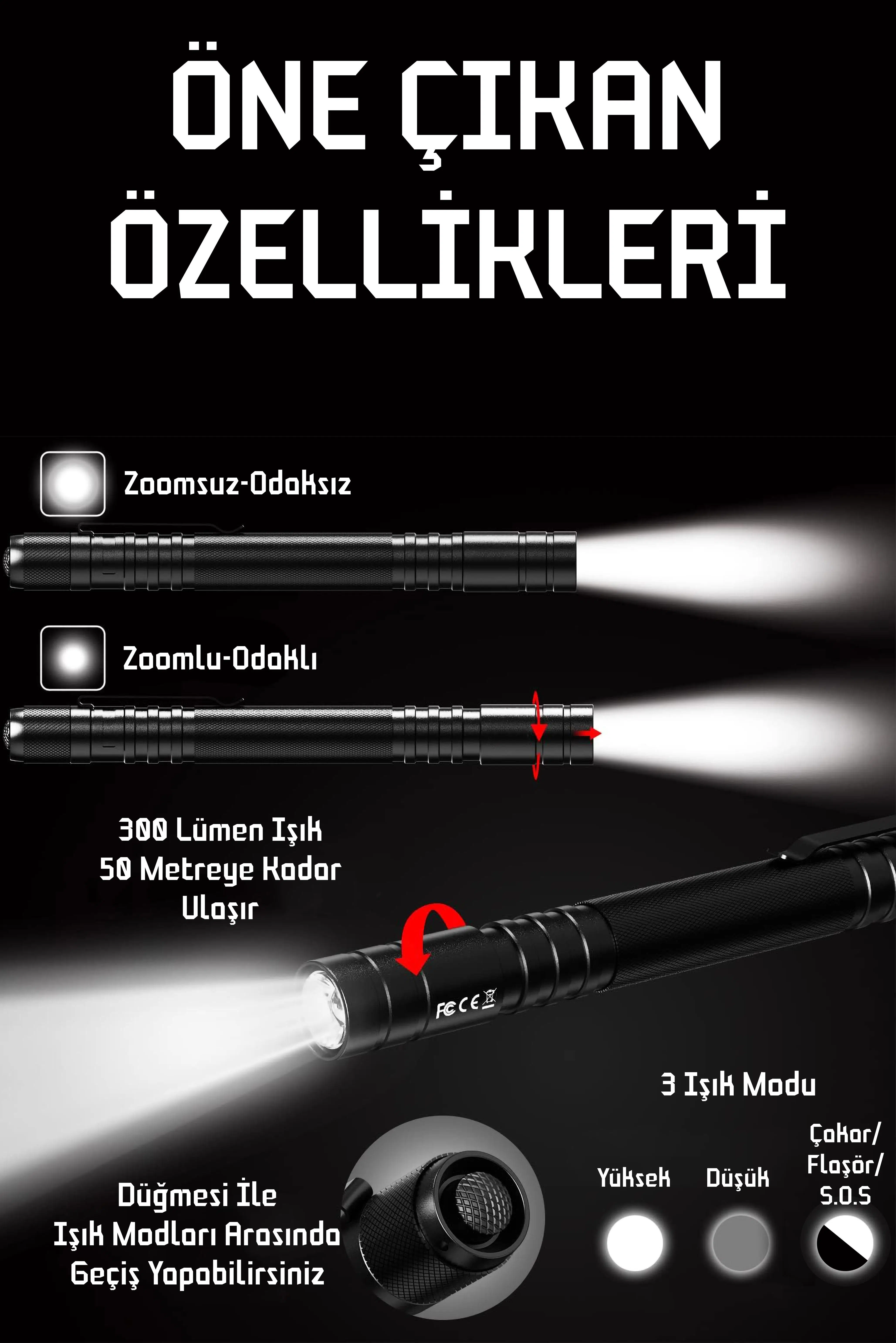 | Etiketler | 3 MOD Şarjlı Led Kalem Tipi El Feneri Zoomlu Flaşörlü Polis Feneri 5 Watt Beyaz Işık 300 Lümen |