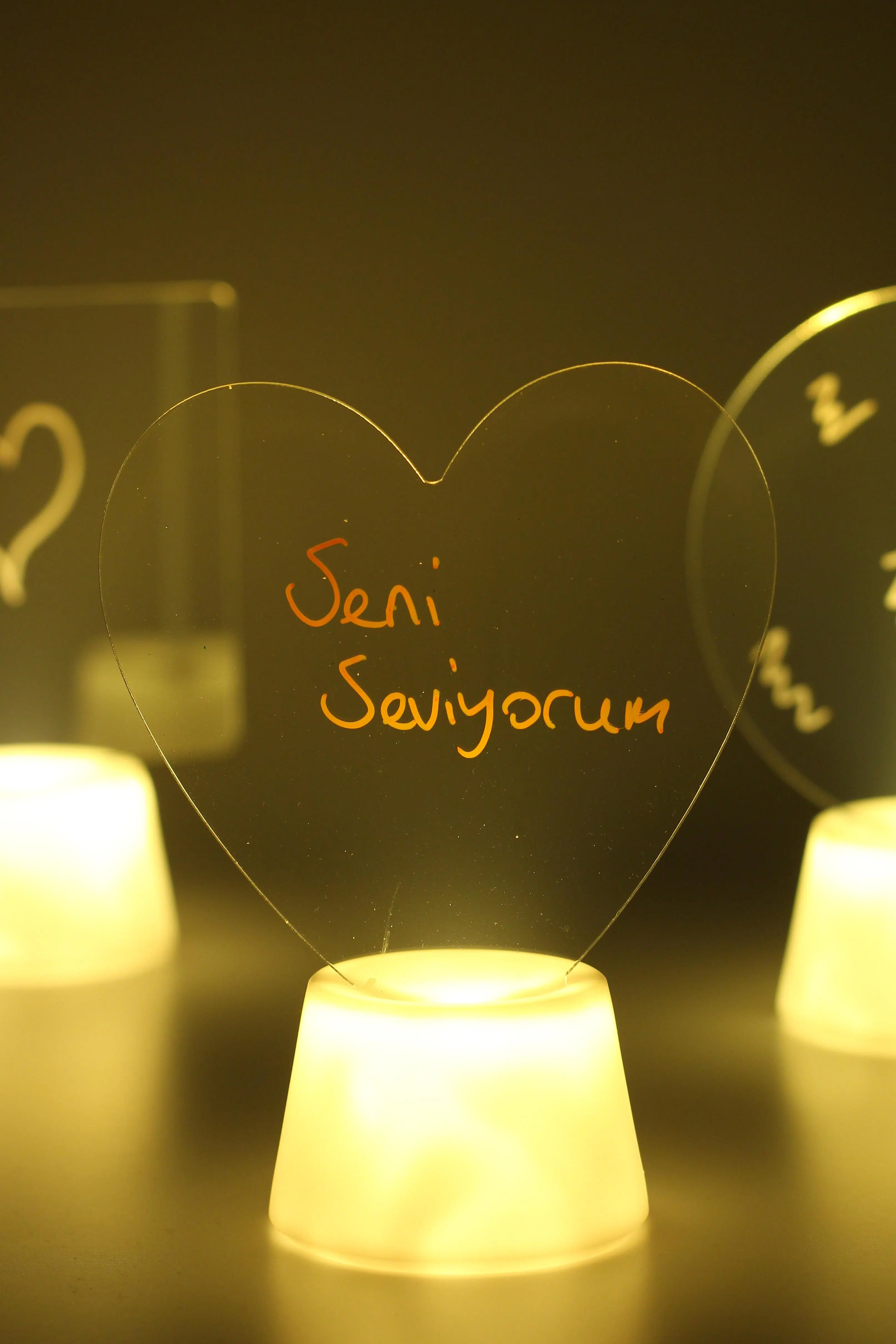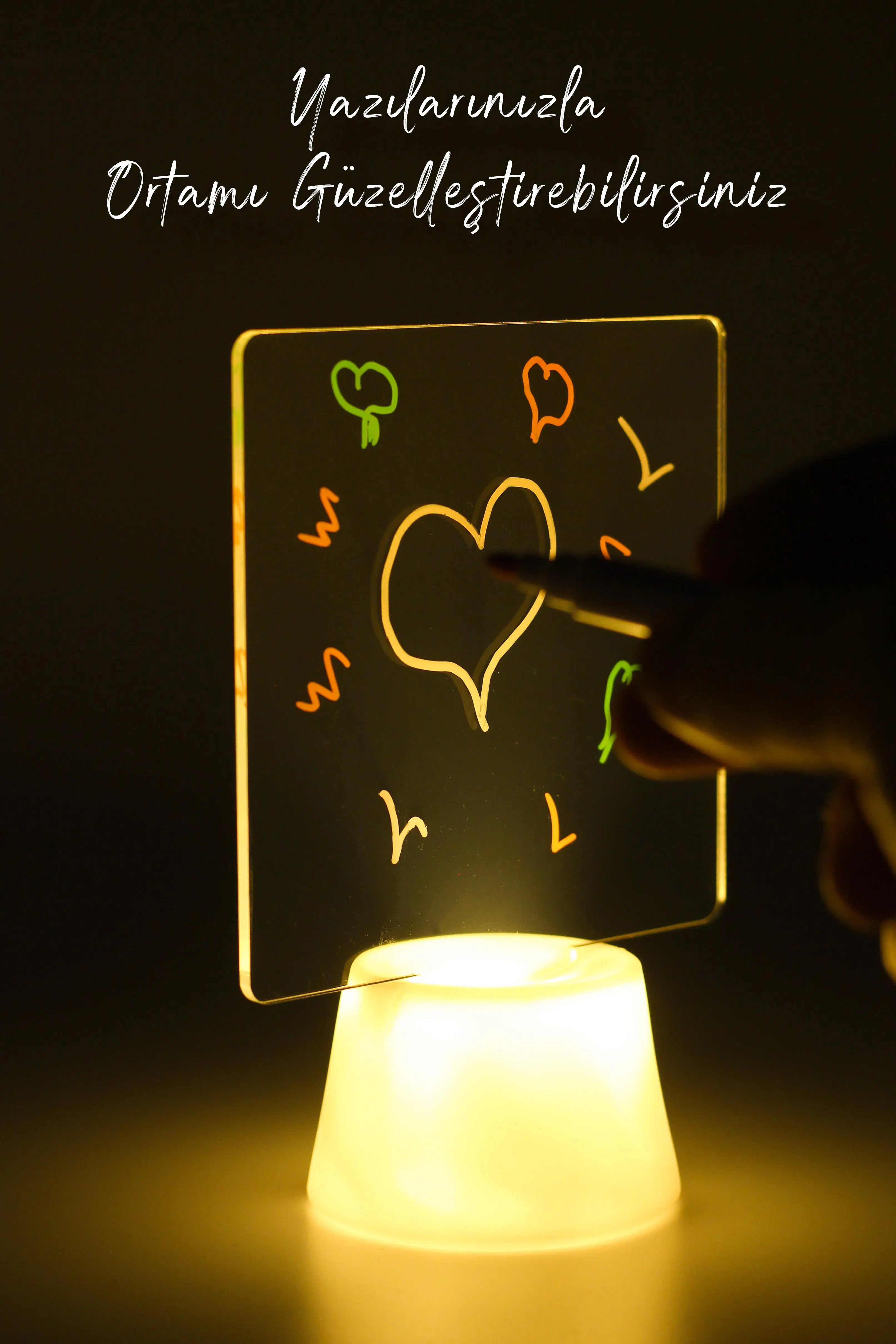 Ürün, şık ve dekoratif bir LED yazı tahtasıdır. Şeffaf bir akrilik levha üzerine, istediğiniz mesajları yazabileceğiniz bir tasarıma sahiptir. Ürün, alt kısmında bulunan LED aydınlatması sayesinde mesajınızı daha da belirgin ve göz alıcı hale getirir.