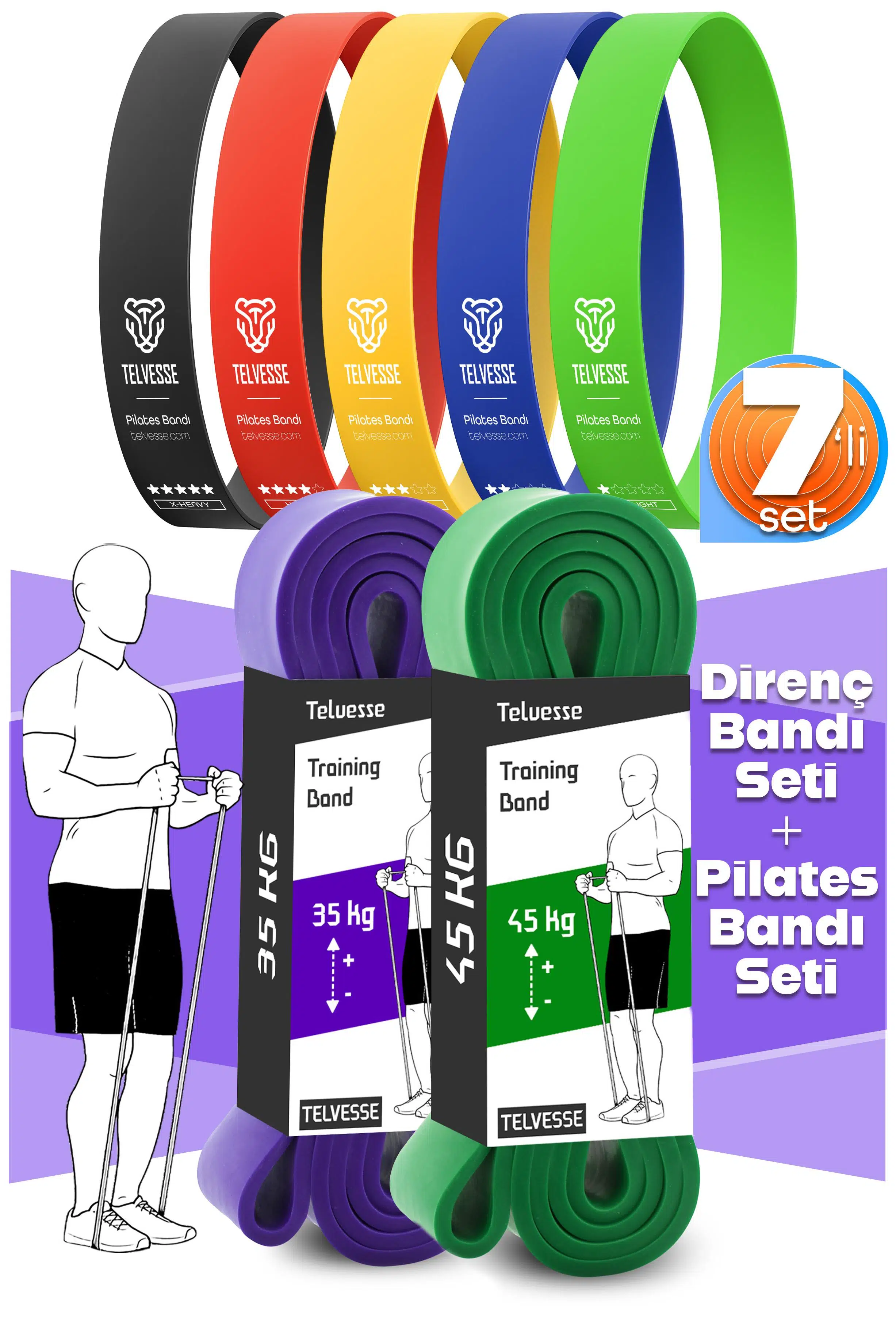 Telvesse 7'li set ile hem direnç hem pilates antrenmanlarınızı tek pakette birleştirin. %100 doğal lateksten üretilmiş bu dayanıklı bantlar, başlangıç seviyesinden ileri seviyeye kadar herkese hitap eder.
