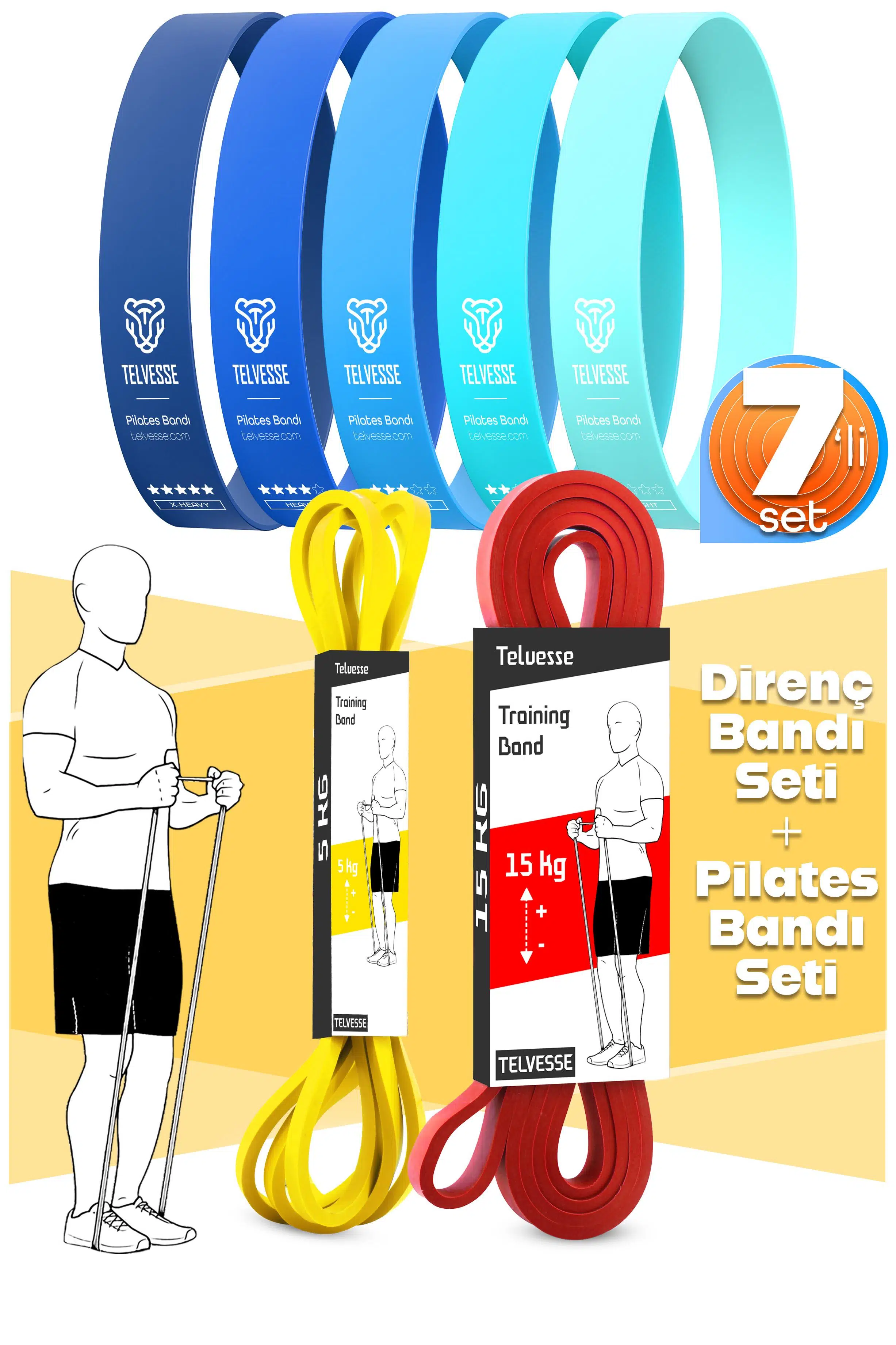 Telvesse 7'li set ile hem direnç hem pilates antrenmanlarınızı tek pakette birleştirin. %100 doğal lateksten üretilmiş bu dayanıklı bantlar, başlangıç seviyesinden ileri seviyeye kadar herkese hitap eder.
