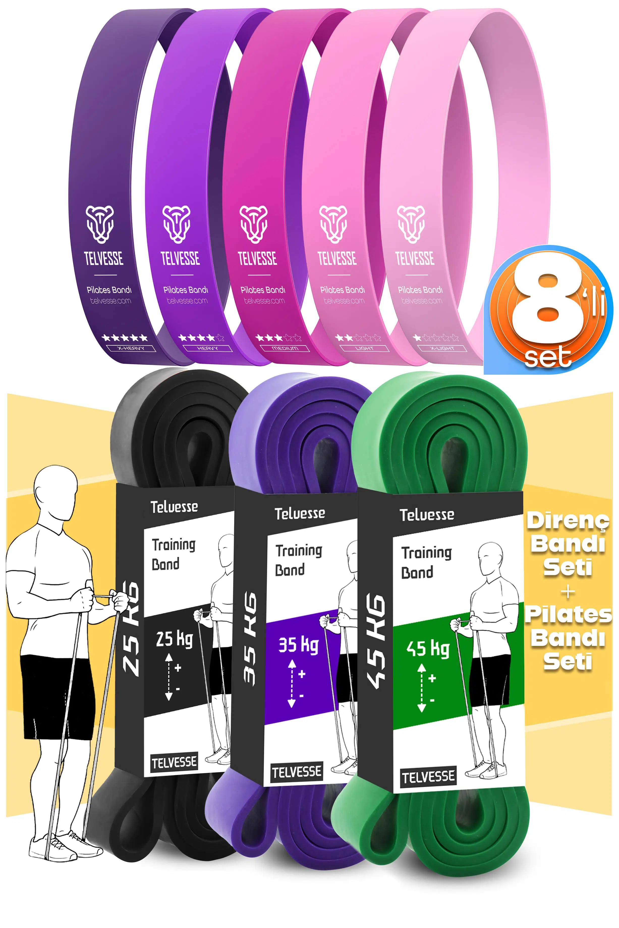 Telvesse 8'li set ile hem direnç hem pilates antrenmanlarınızı tek pakette birleştirin. %100 doğal lateksten üretilmiş bu dayanıklı bantlar, başlangıç seviyesinden ileri seviyeye kadar herkese hitap eder.