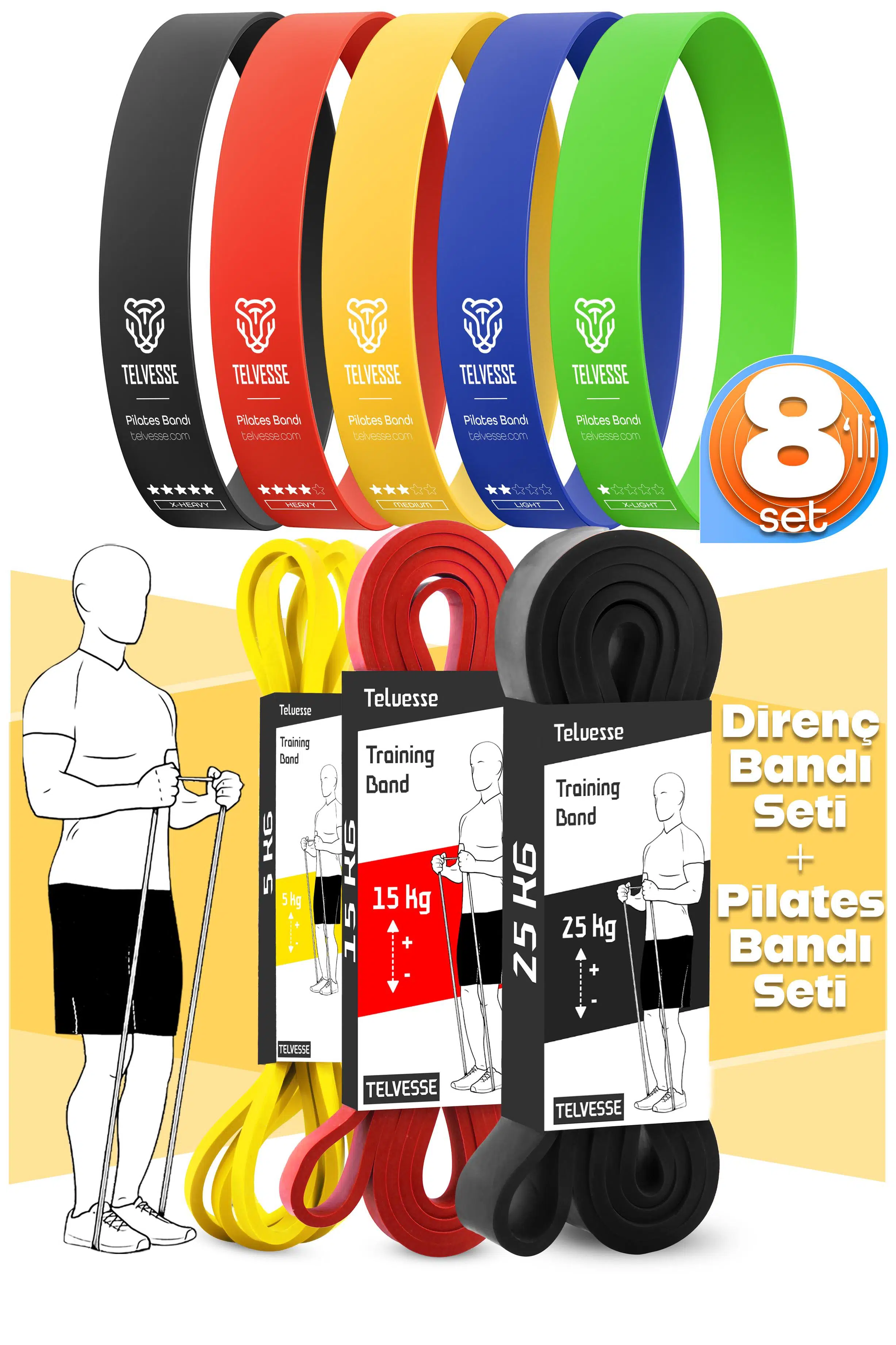 Telvesse 8'li set ile hem direnç hem pilates antrenmanlarınızı tek pakette birleştirin. %100 doğal lateksten üretilmiş bu dayanıklı bantlar, başlangıç seviyesinden ileri seviyeye kadar herkese hitap eder.