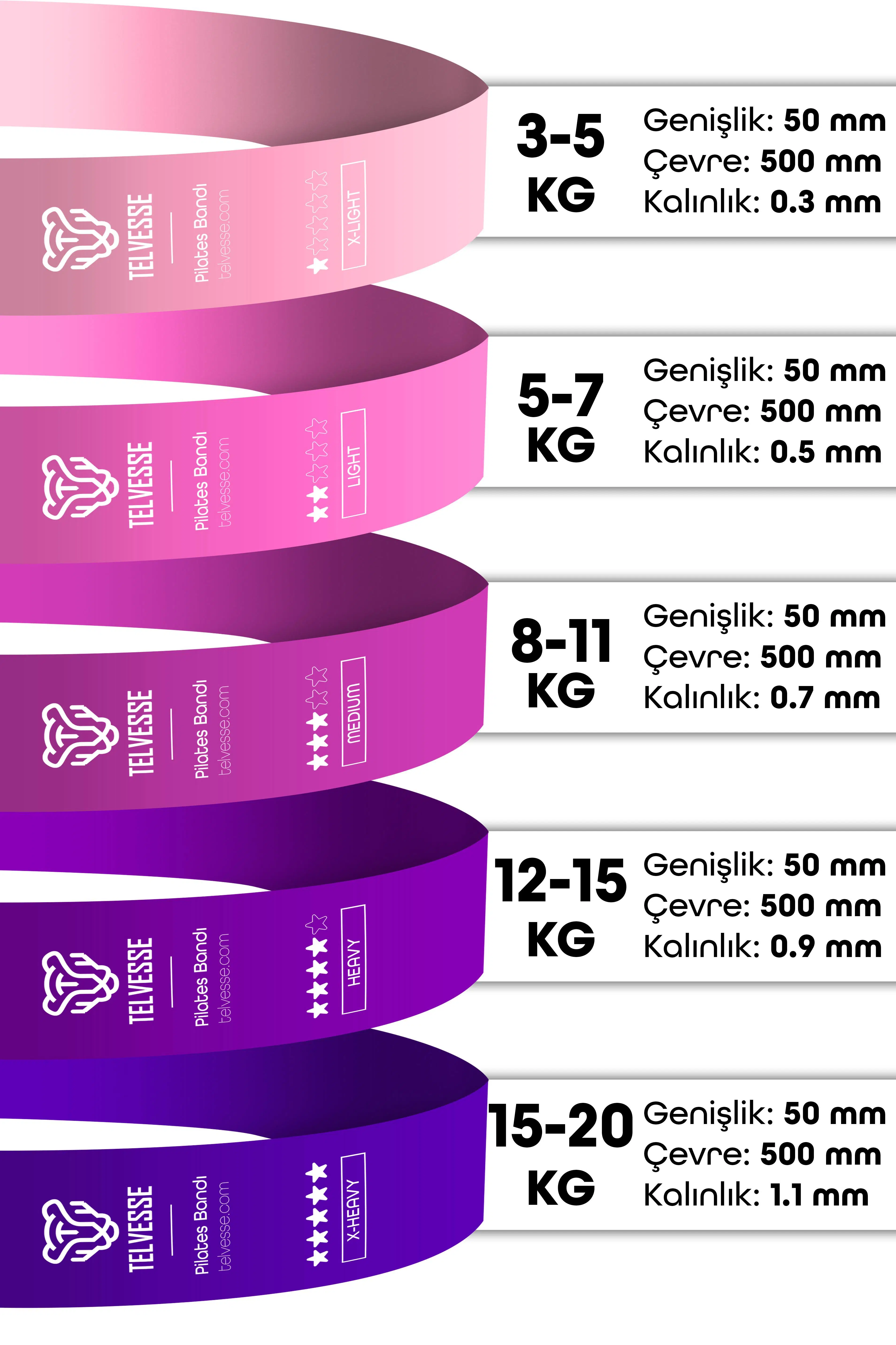 5 Pilates Bandı (3-20 kg arası direnç: XLIGHT → XHEAVY)