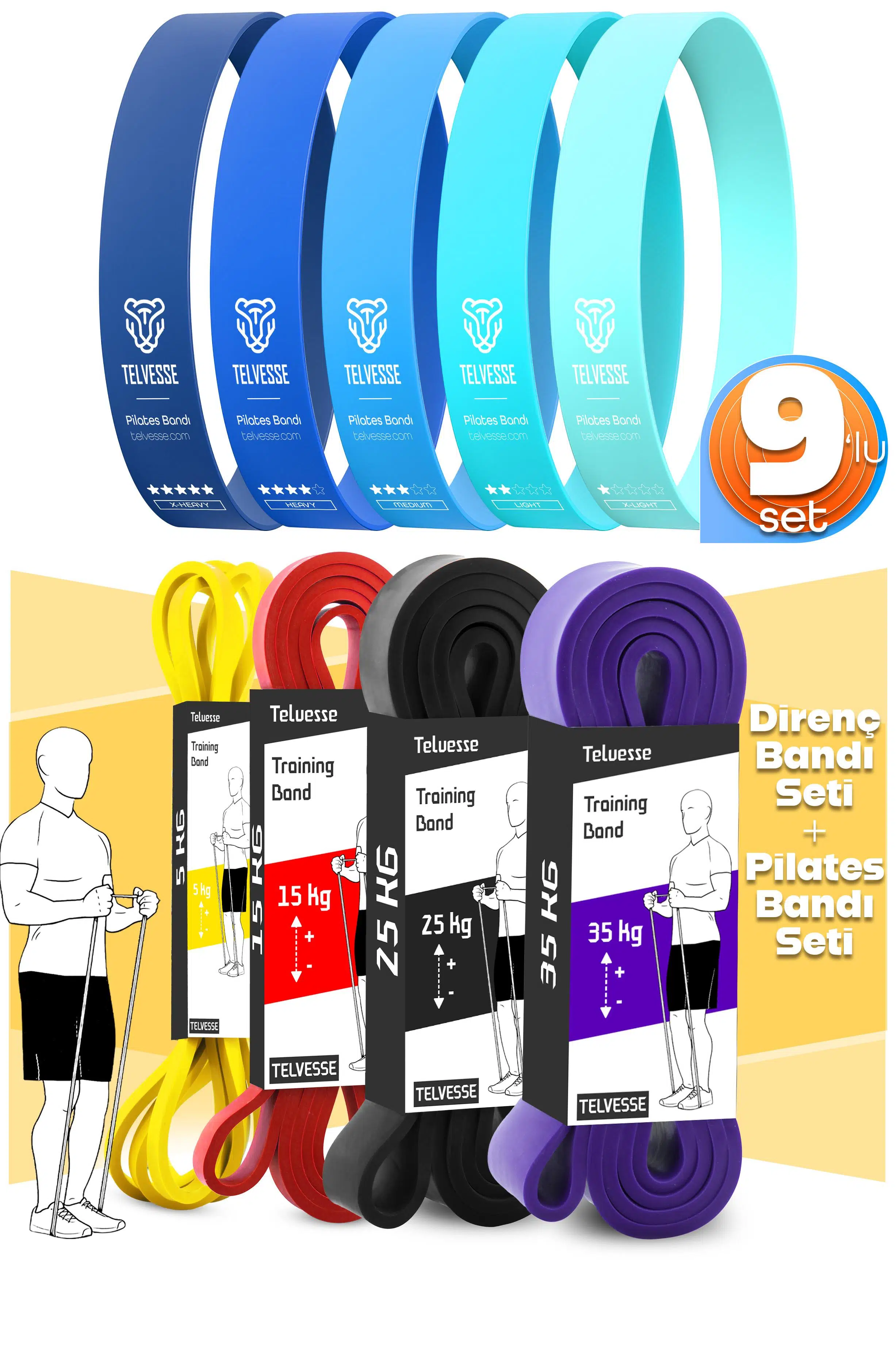 Telvesse 9'lu set ile hem direnç hem pilates antrenmanlarınızı tek pakette birleştirin. %100 doğal lateksten üretilmiş bu dayanıklı bantlar, başlangıç seviyesinden ileri seviyeye kadar herkese hitap eder.
