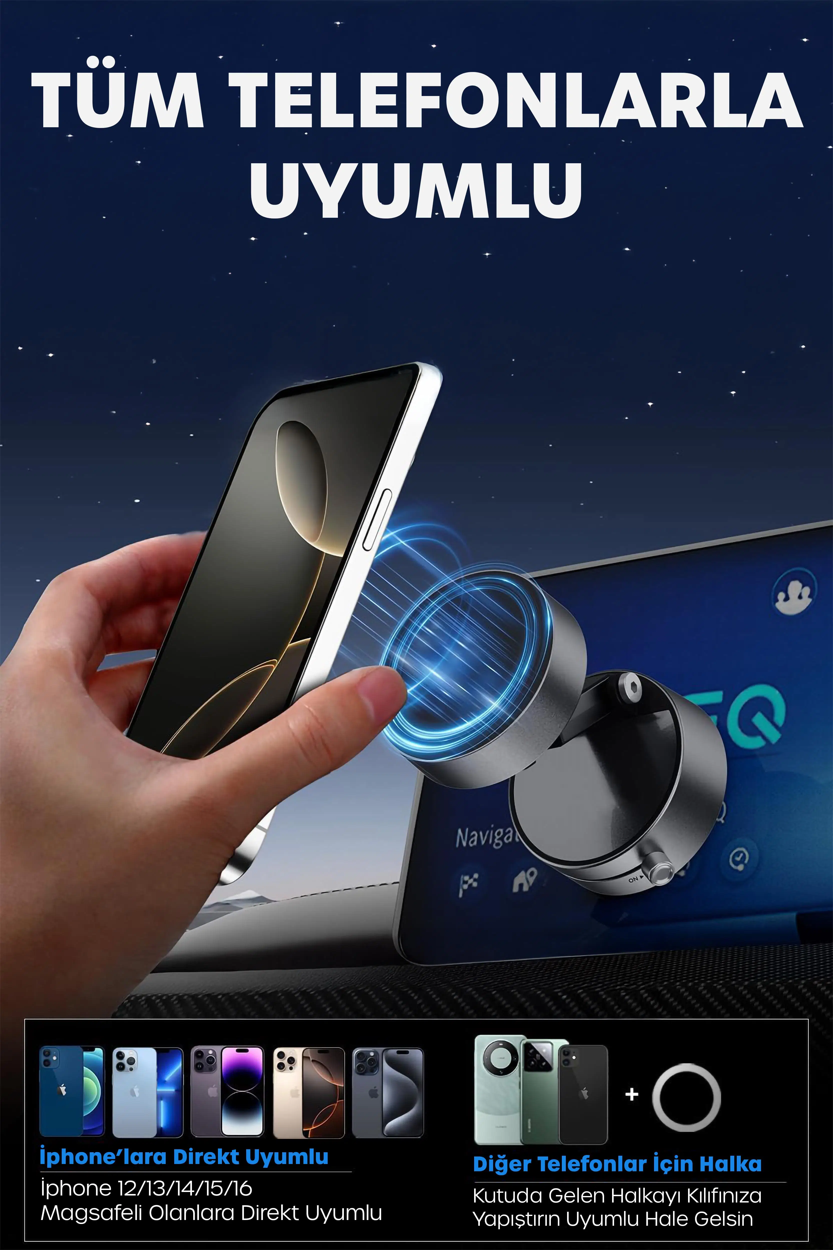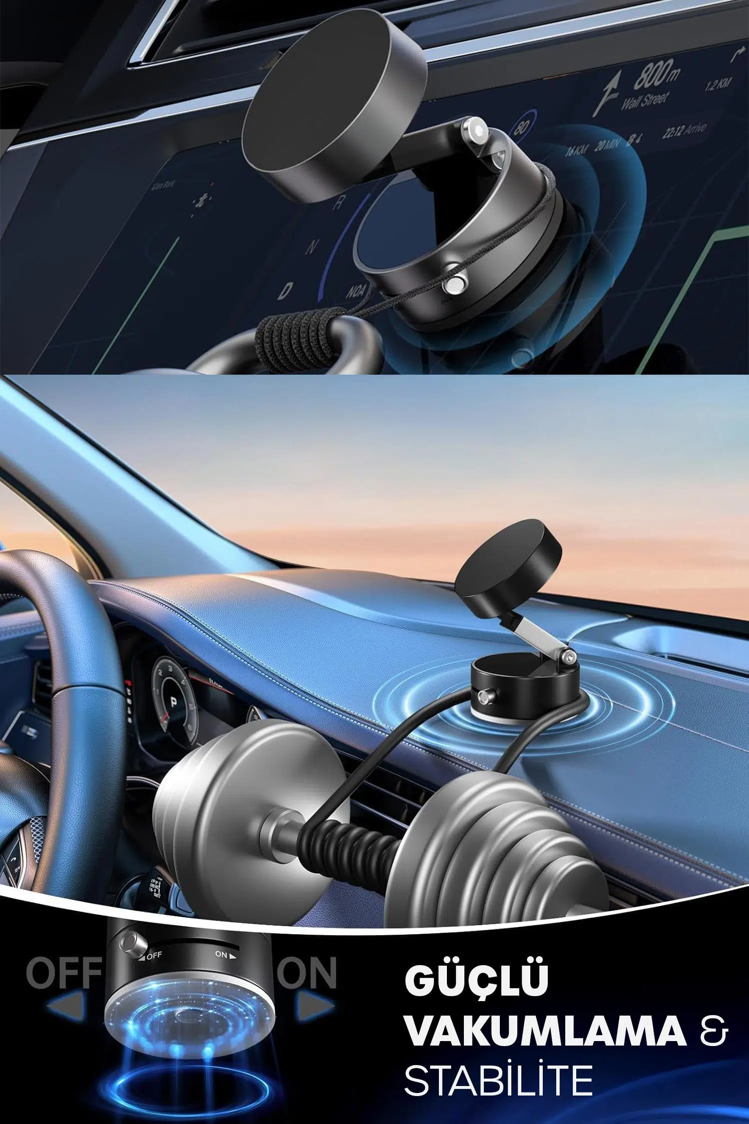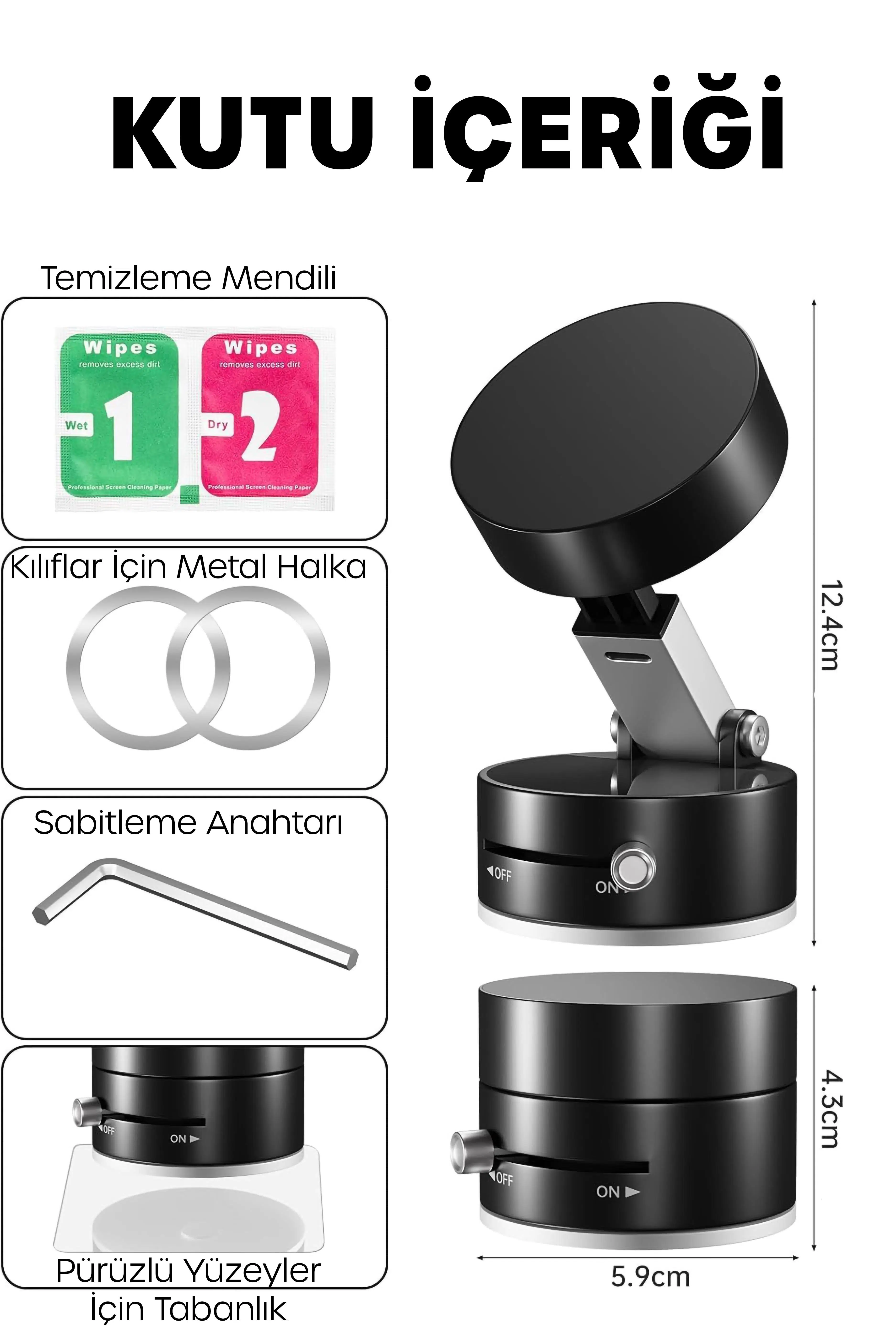 Araç içinde telefonunuzu güvenle sabitlemek için tasarlanan vakumlu manyetik telefon tutucu, güçlü vakum sistemi, ayarlanabilir yapısı ve tüm telefonlarla uyumluluğu sayesinde sürüş sırasında maksimum konfor ve güvenlik sunar.