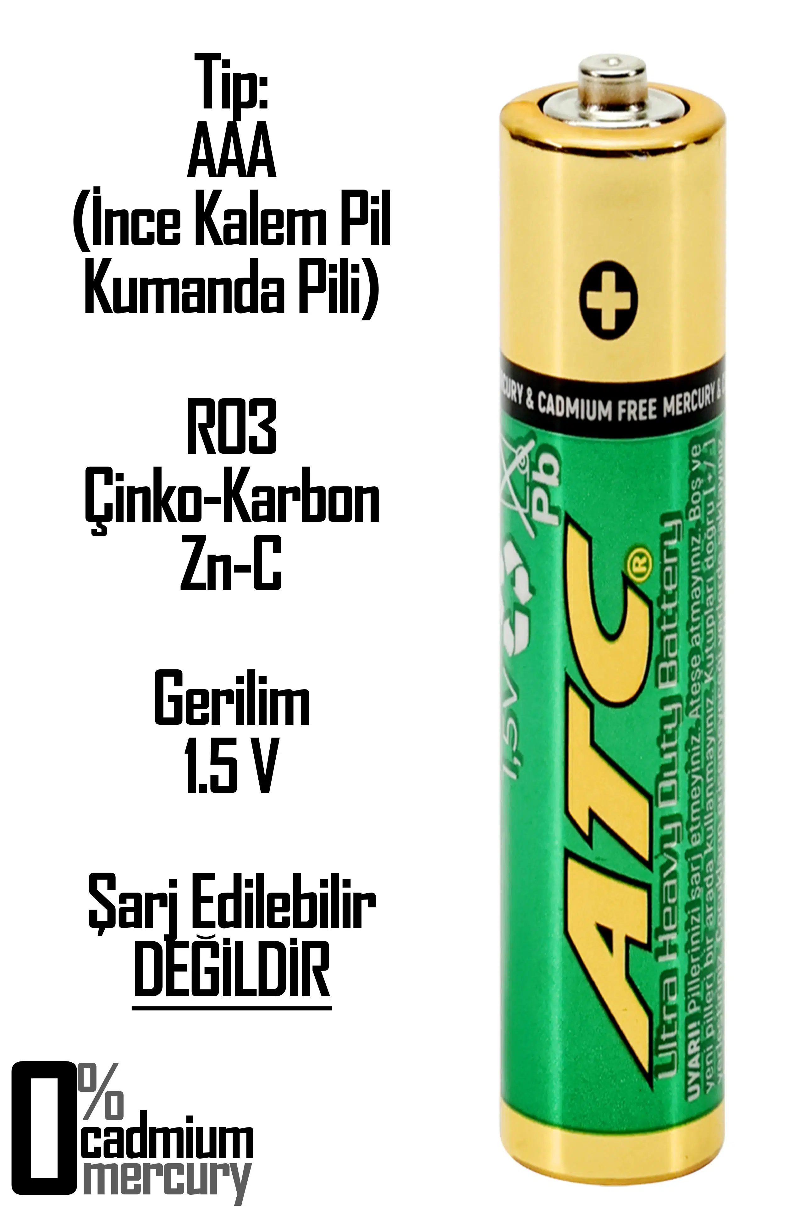 | Etiketler | ATC 4lü AAA Heavy Duty R03 İnce Kalem Pil Kumanda Pili Çinko Karbon Pil Zn-C 1.5V |