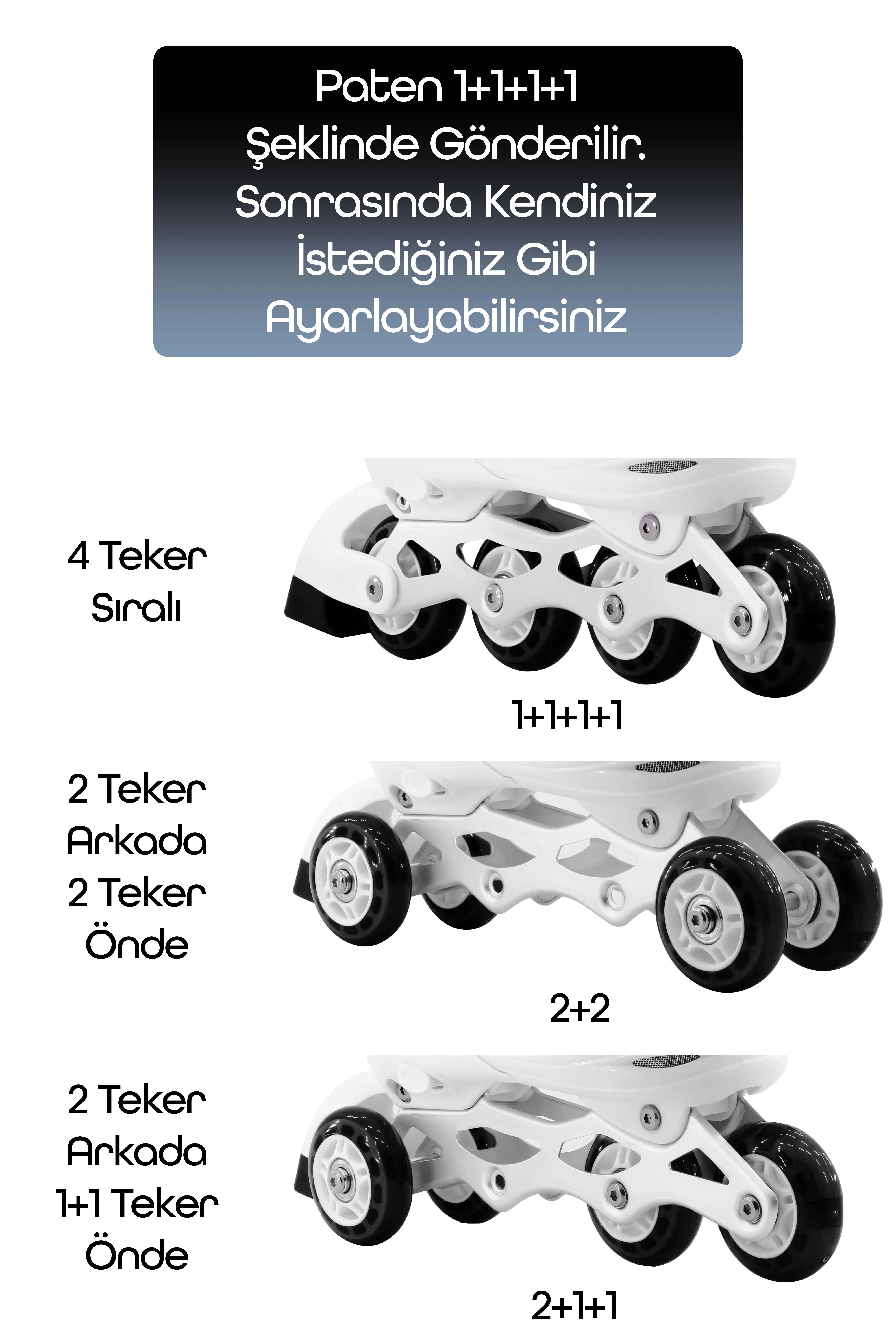 Ayarlanabilir Tekerlek Sistemi: Paten, 1+1+1+1, 2+2 ve 2+1+1 olmak üzere üç farklı tekerlek düzeninde kullanılabilir. Tekerlek düzeni, kolayca ve isteğe göre ayarlanabilir. Paten 1+1+1+1 şeklinde gönderilir, ancak siz istediğiniz gibi 2+2 veya 2+1+1 düzenine getirebilirsiniz.
