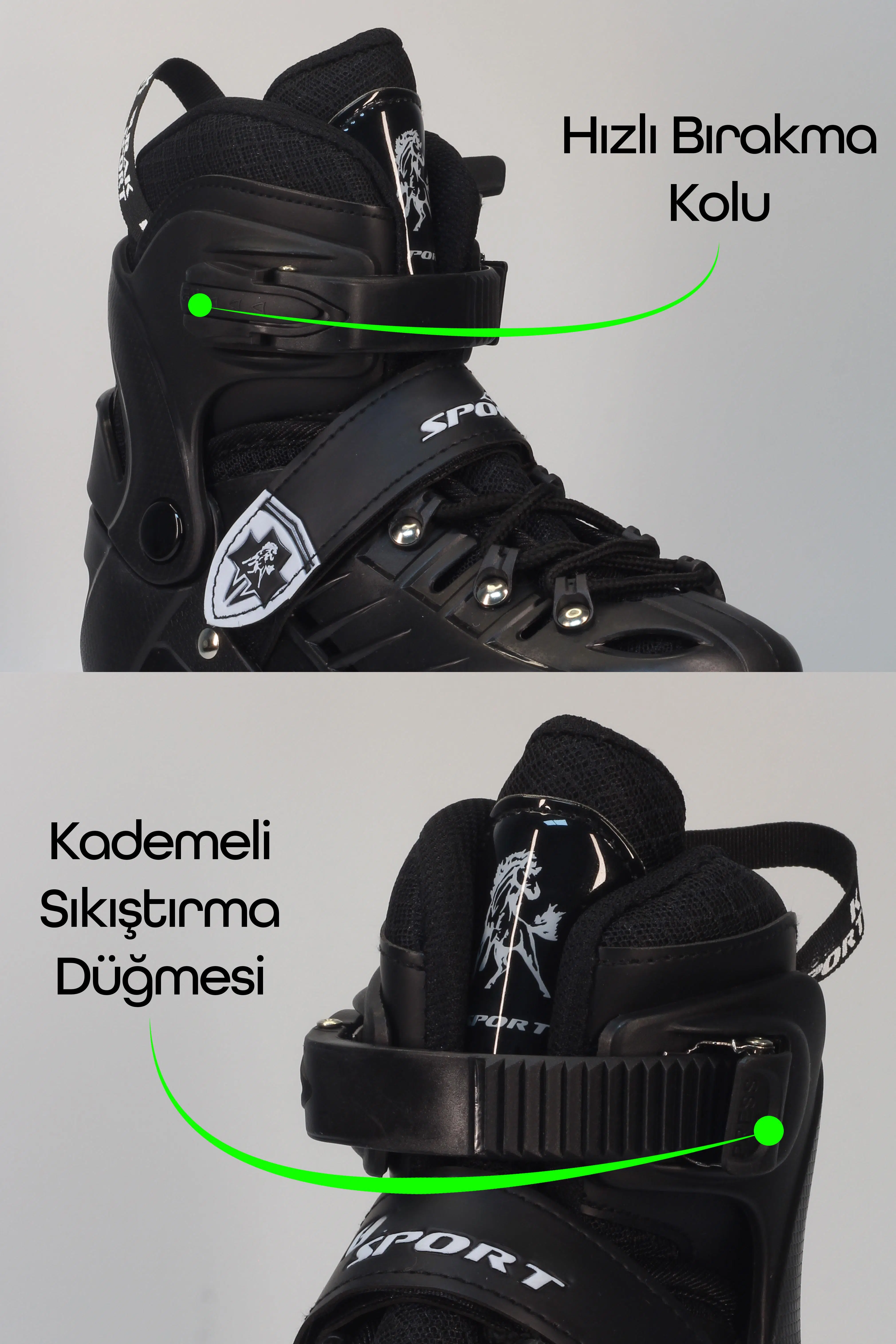 Hızlı Bırakma Kolu ve Kademeli Sıkıştırma Düğmesi: Pratik hızlı bırakma kolu sayesinde patenleri kolayca giyip çıkarabilirsiniz. Ayakkabının ayağınıza mükemmel şekilde oturmasını sağlayan kademeli sıkıştırma düğmesi ise rahat ve güvenli bir kullanım sunar. (Resimlerdeki gibi)