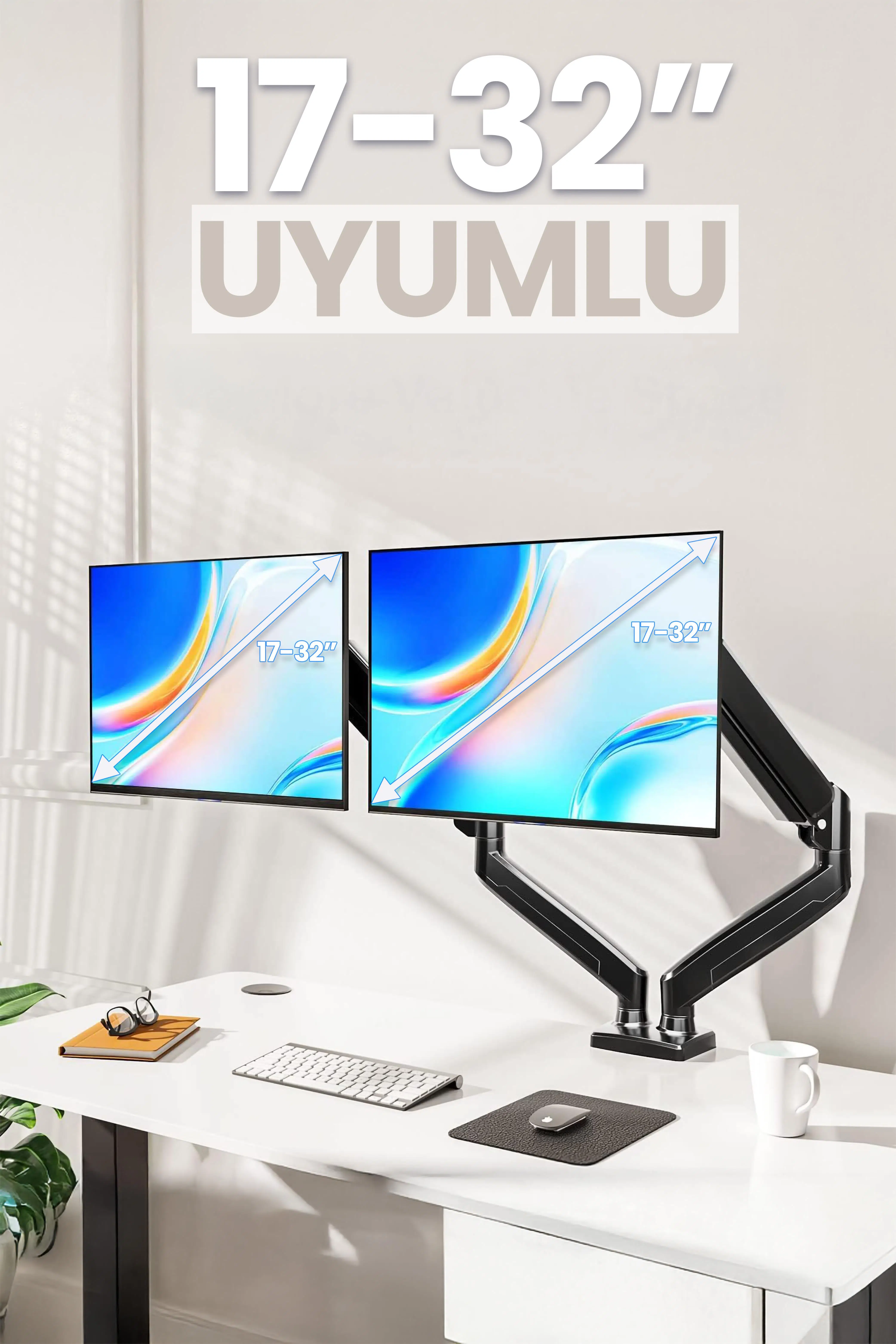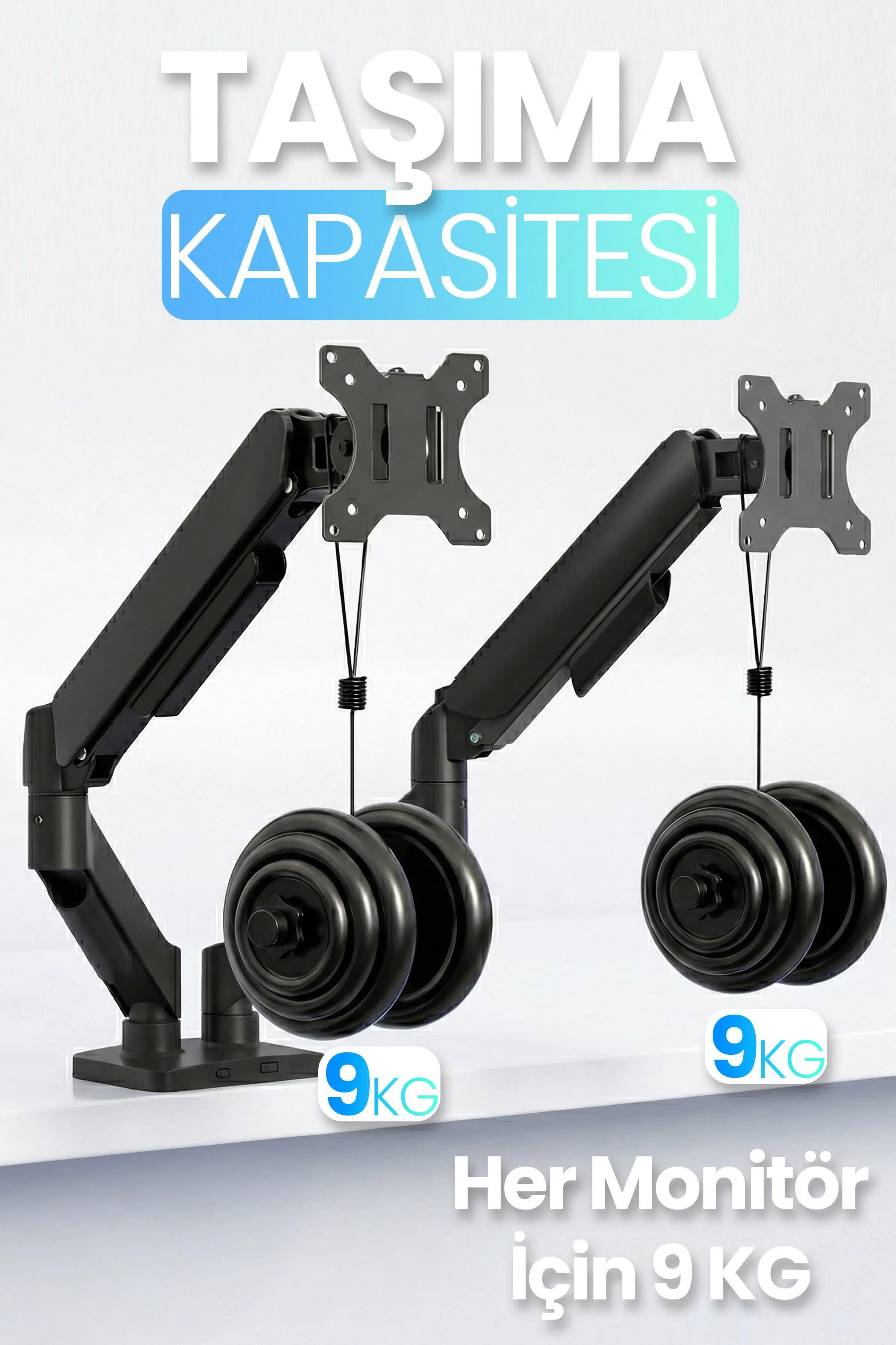 Pistonlu Çiftli Monitör Kolu – 17”-32” Uyumlu | Her Monitör İçin 2–9 KG Taşıma Kapasitesi