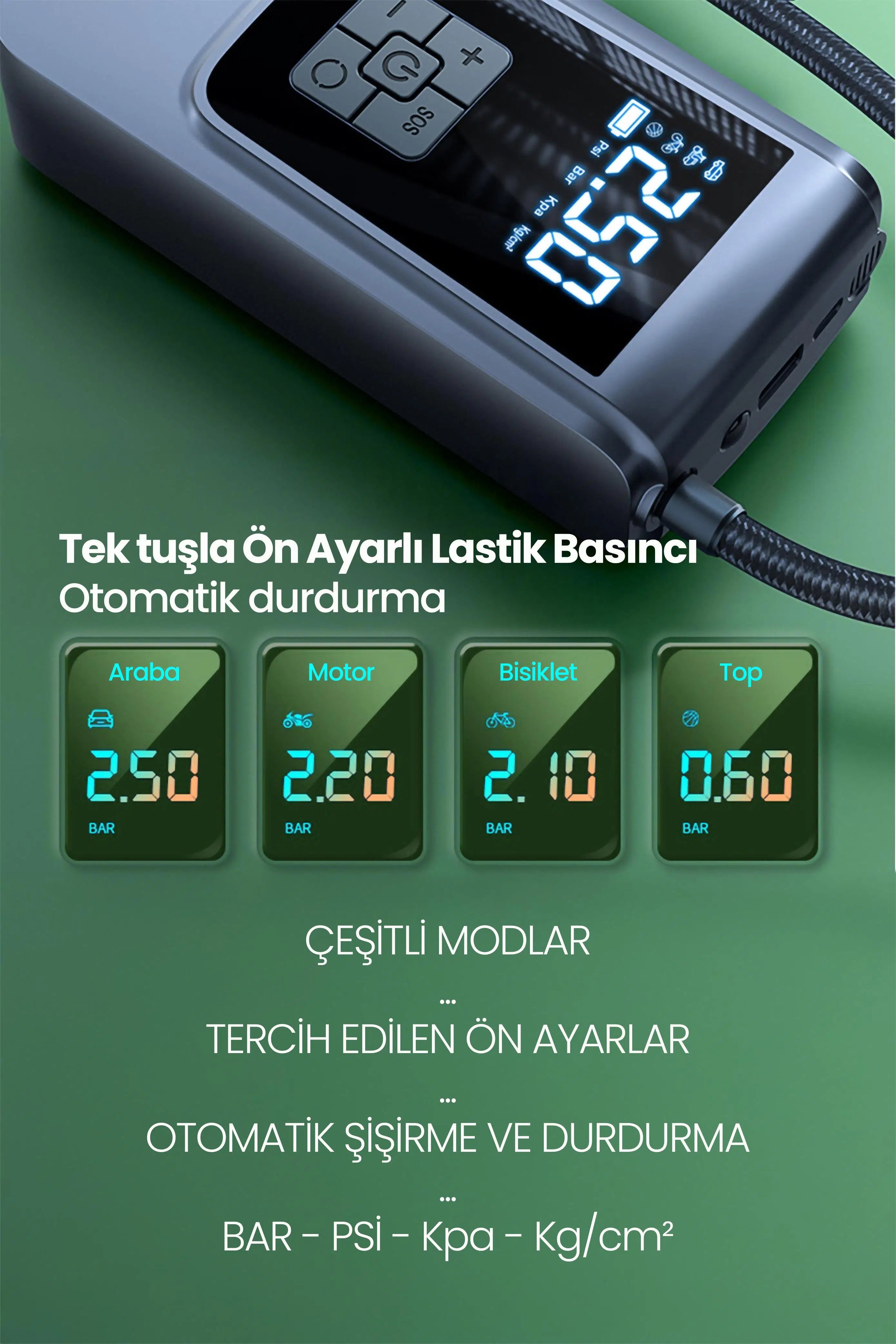 Araç, motosiklet ve bisiklet lastiklerinin hava basıncını hızlı ve zahmetsiz şekilde ayarlamak için geliştirilen şarjlı dijital hava kompresörü; ön ayarlı basınç seçimi, otomatik durdurma sistemi, çoklu kullanım modları, powerbank özelliği ve entegre feneri ile tek cihazda pratik çözüm sunar. Kablosuz yapısı sayesinde bagajda, motosiklet çantasında veya sırt çantasında kolayca taşınabilir ve ihtiyaç duyulan her yerde kullanılabilir.