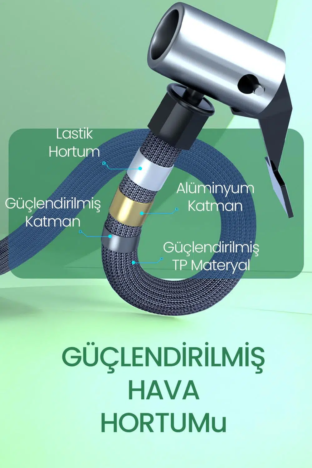 Uzun ömürlü kullanım ve güvenli hava transferi için hortum çok katmanlı yapı ile üretilmiştir:
