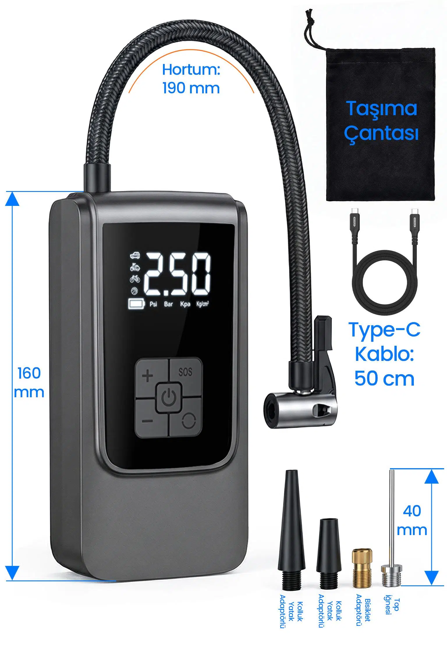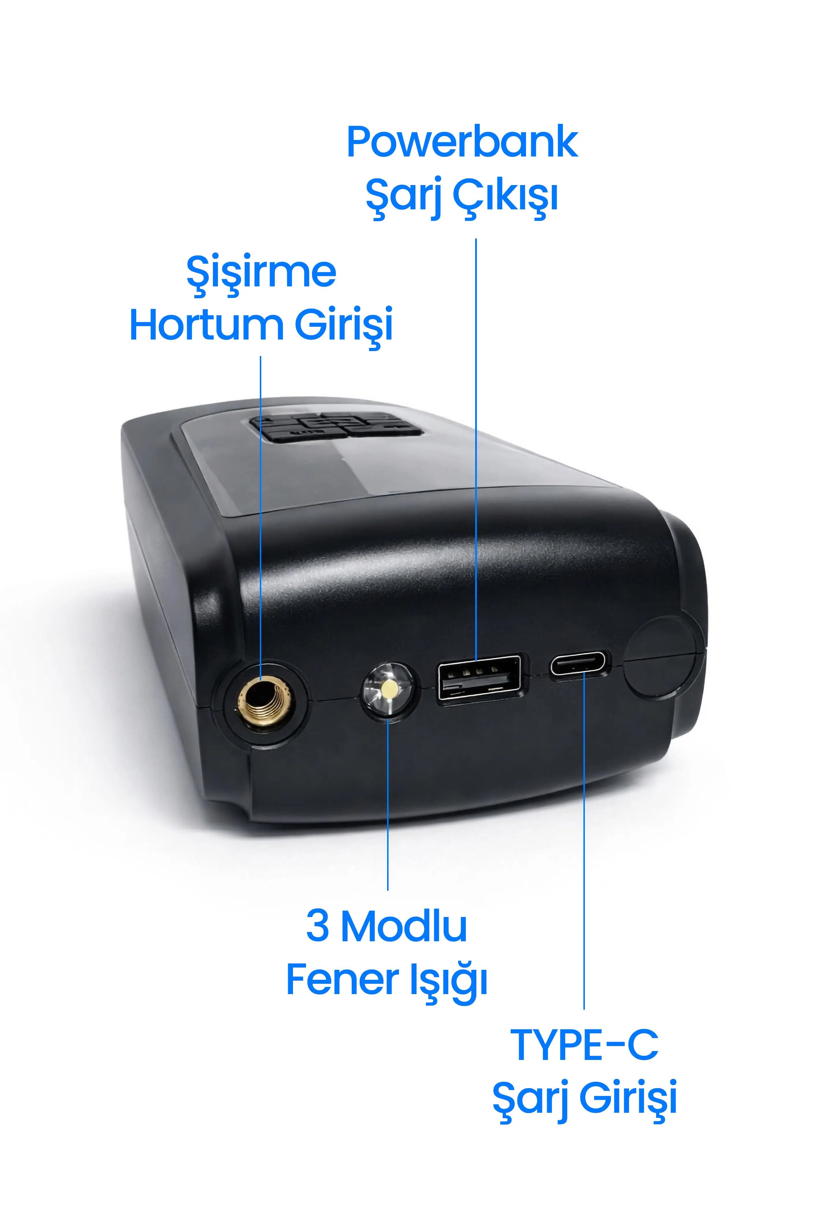 | Etiketler | Dijital Ekranlı Şarjlı Araç Hava Kompresörü LEDli Powerbank Lastik Top Yatak Şişirme Pompası 150psi |
