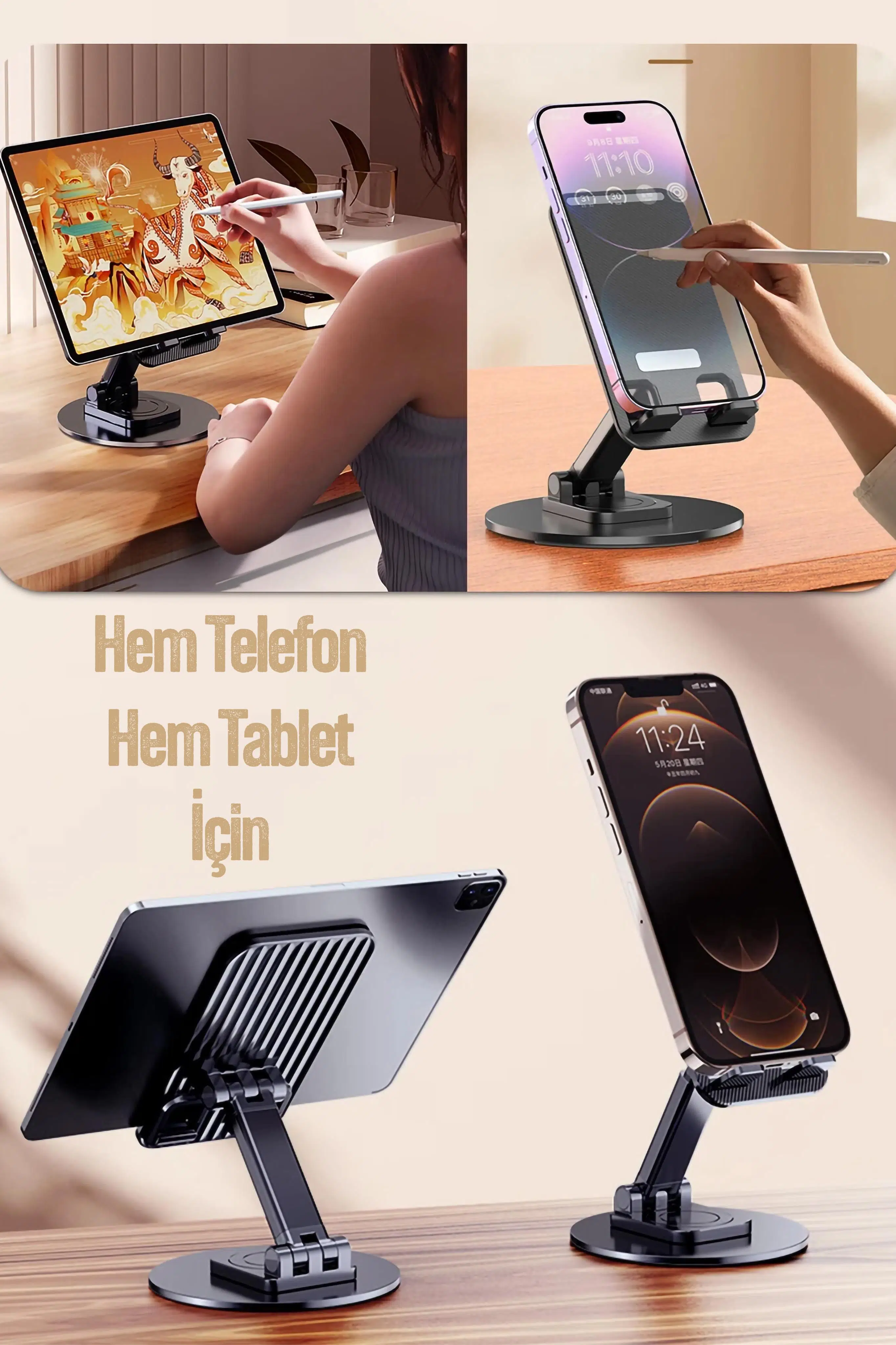 Bu stand, cihazlarınızı kullanırken ergonomik bir kullanım sunar ve masa düzeninizi korumanıza yardımcı olur.