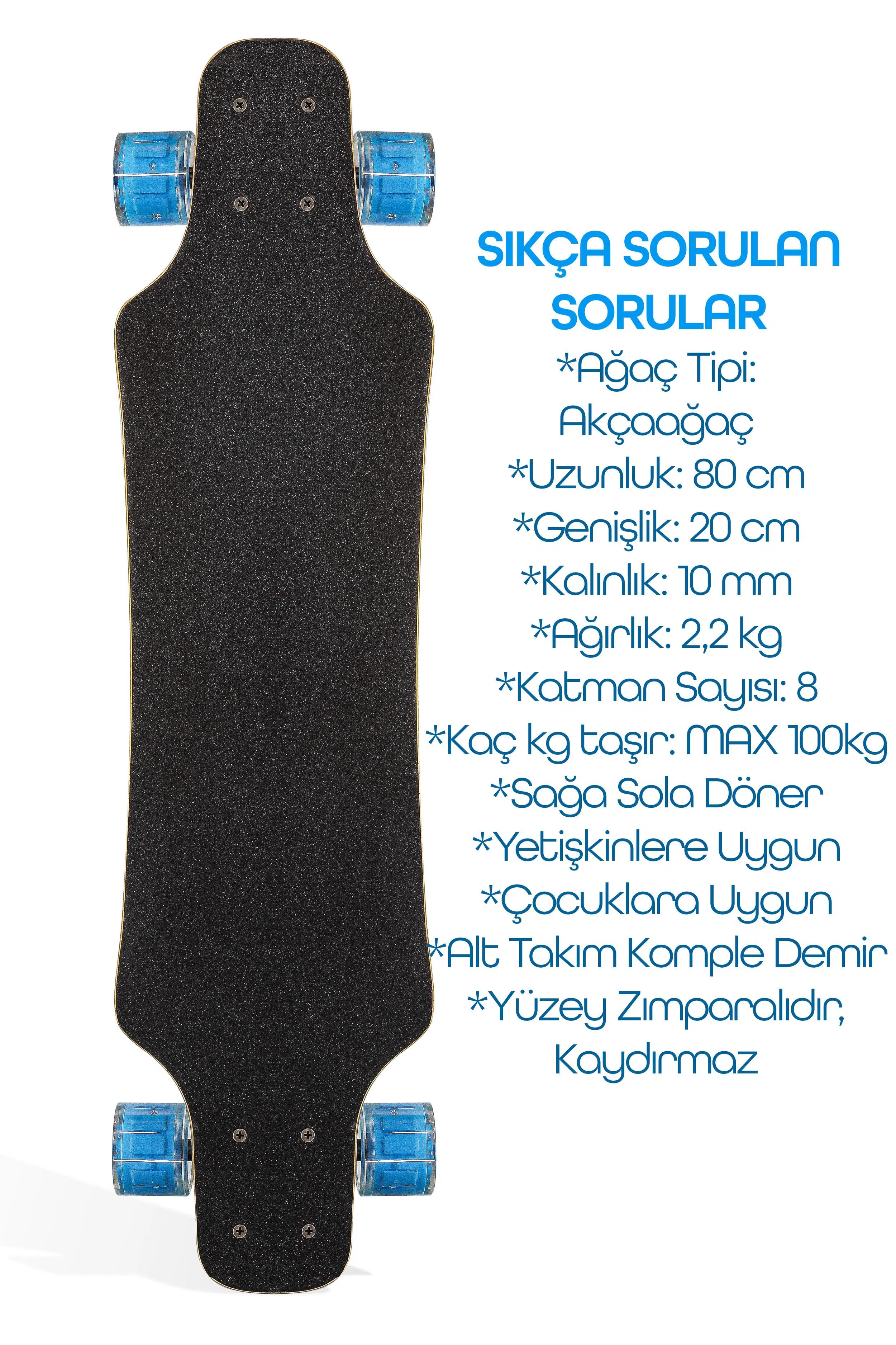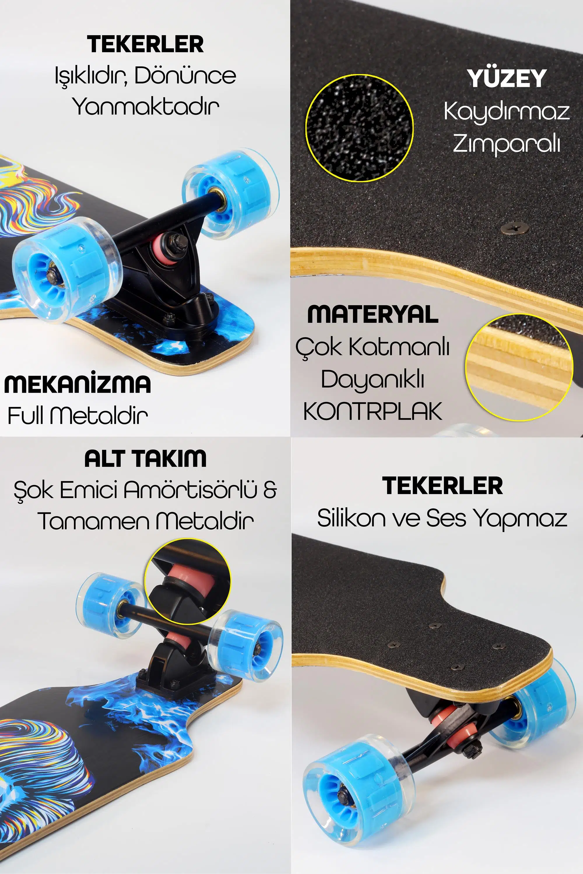 Özetle: Bu longboard, şık tasarımı, sessiz ve ışıklı tekerlekleri, sağlam metal alt takımı ve kaydırmaz yüzeyi ile güvenli ve keyifli bir sürüş deneyimi sunar. Hem çocuklar hem de yetişkinler için uygundur.