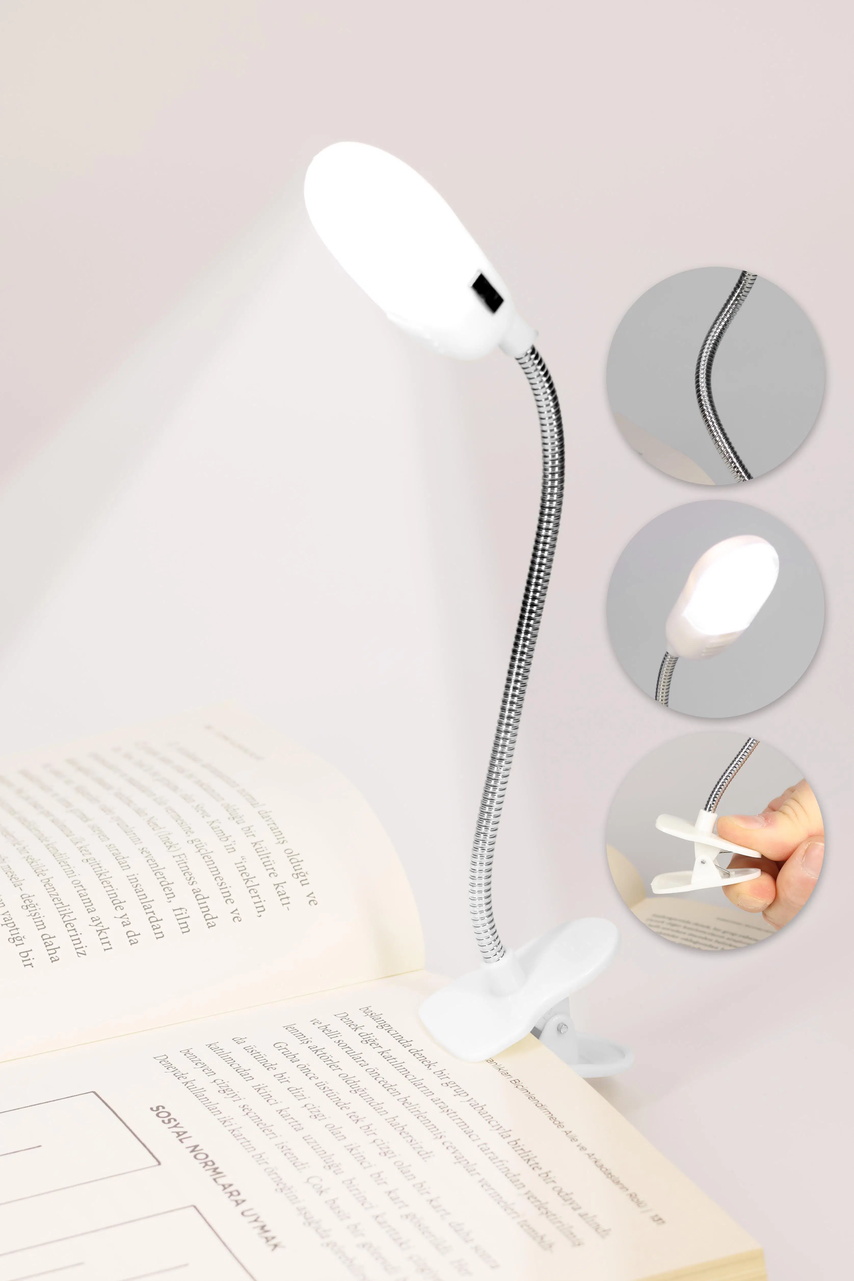 **Ürün:** Beyaz renkli, spiralli ve esnek gövdeli, kitap okumayı kolaylaştıran pratik bir kitap okuma lambası.