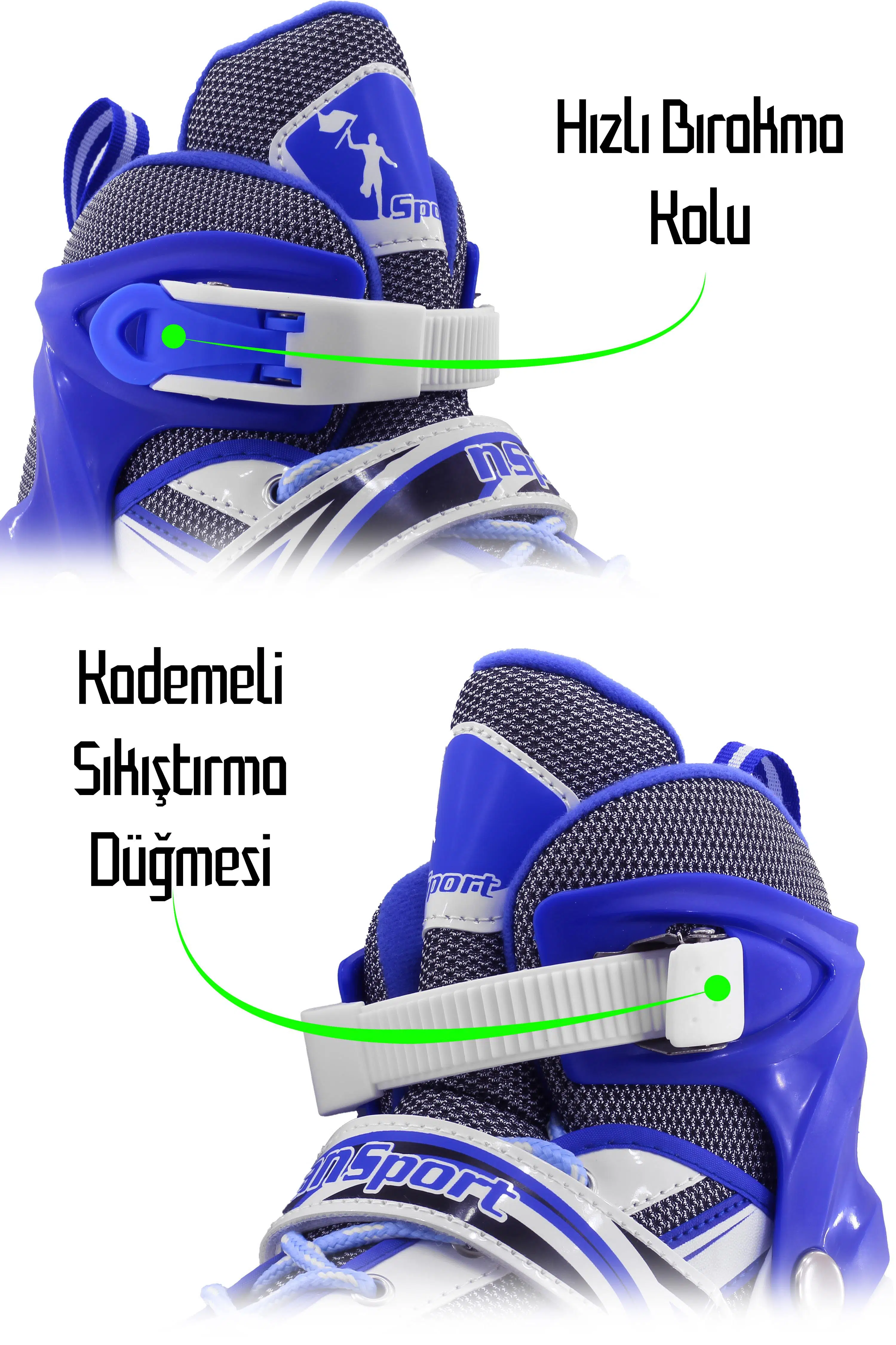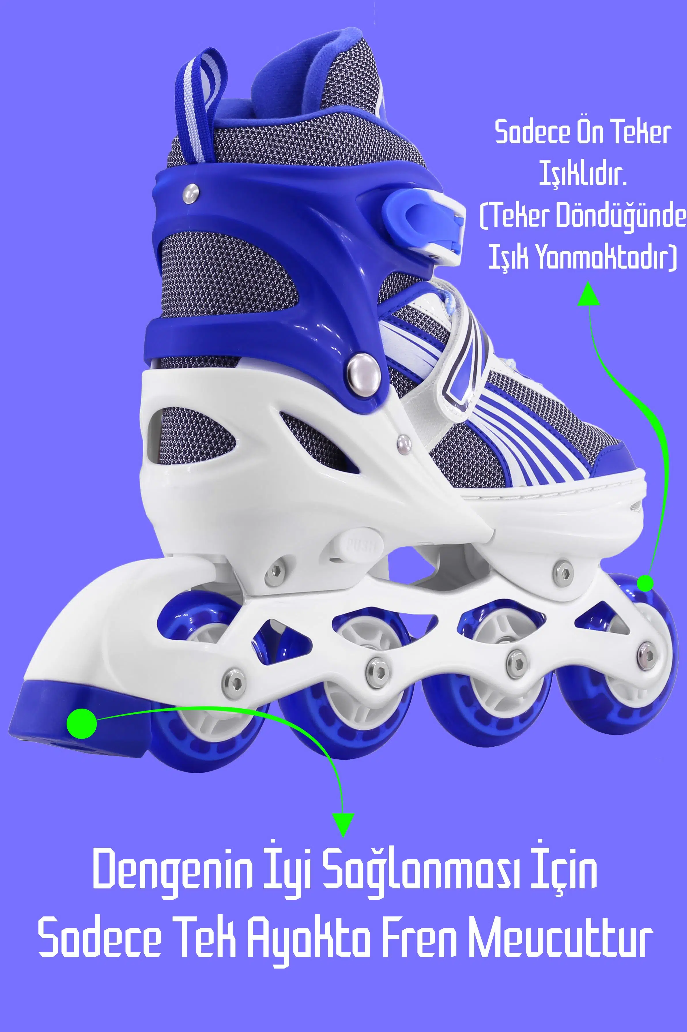 Ürünün küçük yada büyük gelmesi halinde topuk kısmında bulunan PUSH yazılı kısma basılı tutup patenin burun kısmından tutup ileri geri çekerek numara ayarlaması yapabilirsiniz.
