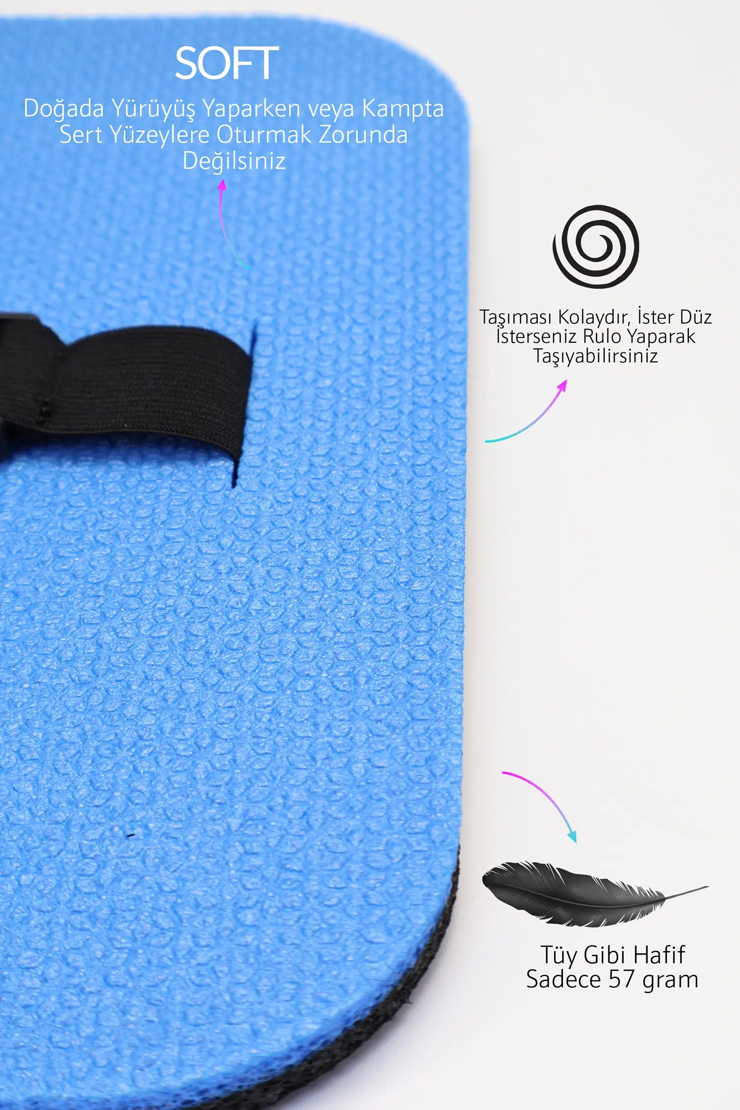 Doğada gezerken, kamp yaparken, trekking sporlarında kullanabileceğiniz çok amaçlı oturma minderi.
