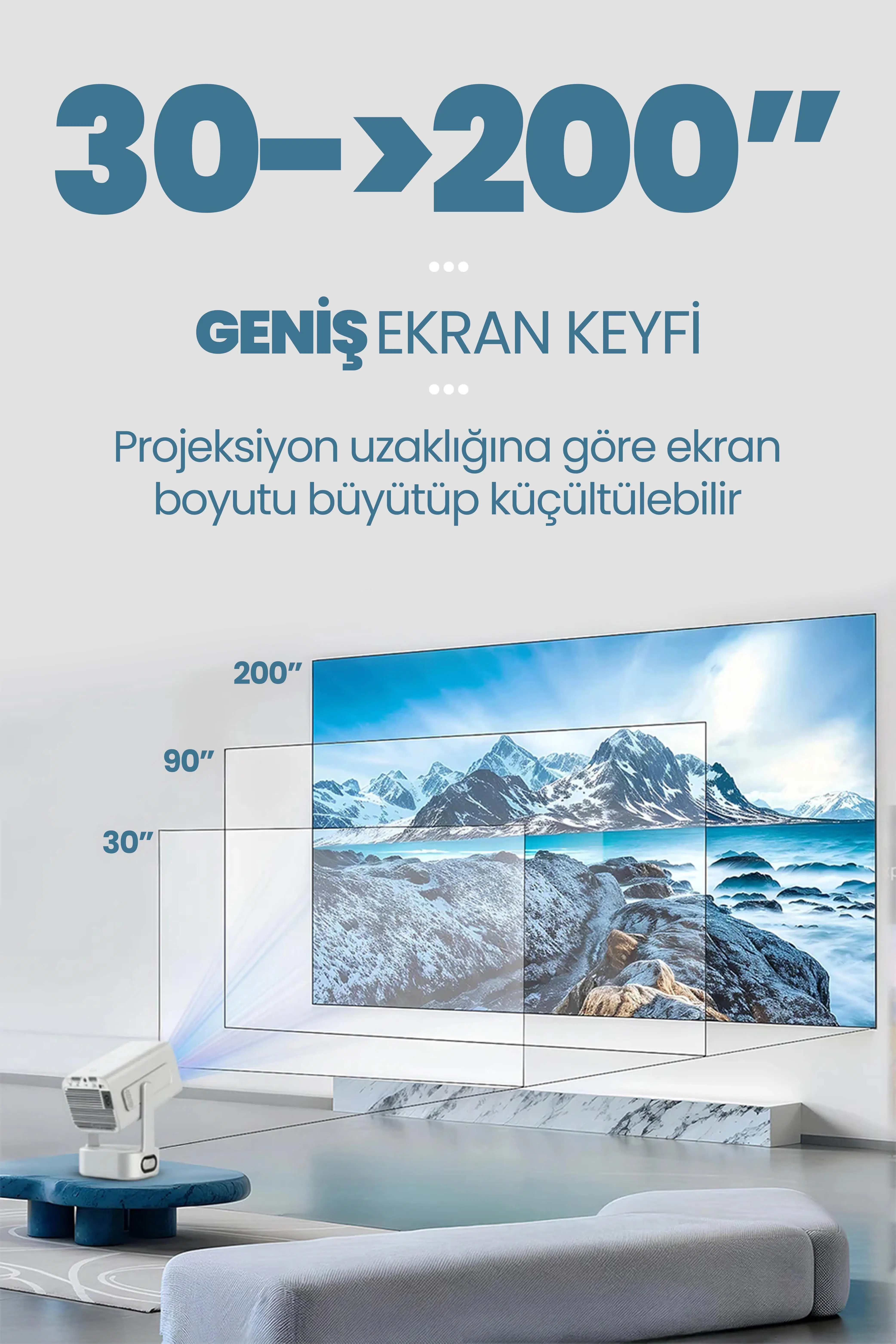 Projeksiyon mesafesine göre ekran boyutu kolayca ayarlanabilir, küçük odalardan geniş salonlara kadar kullanım imkanı sağlar.
