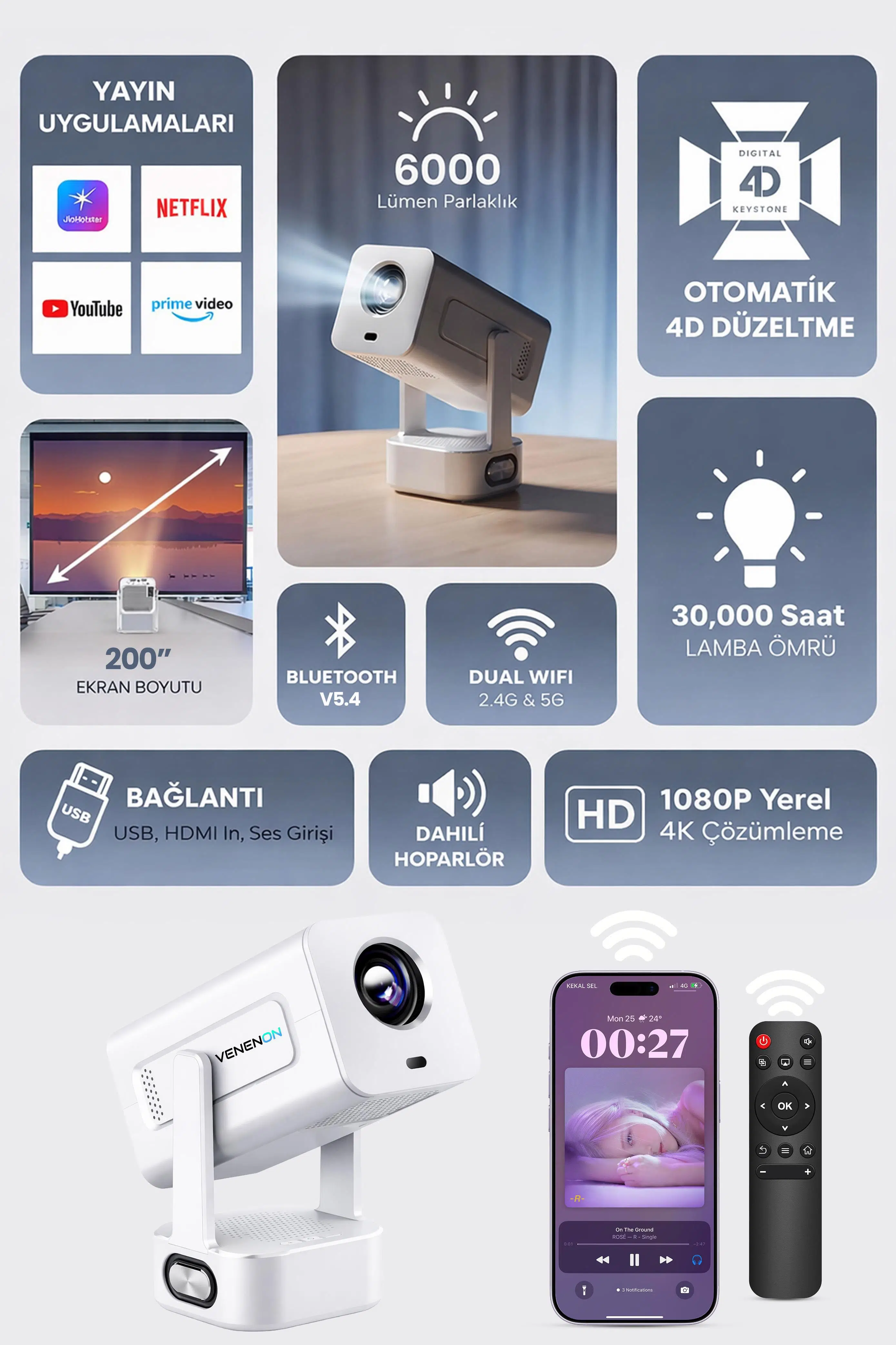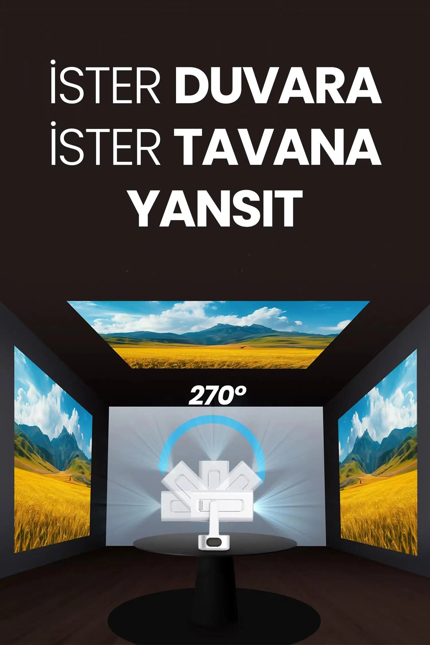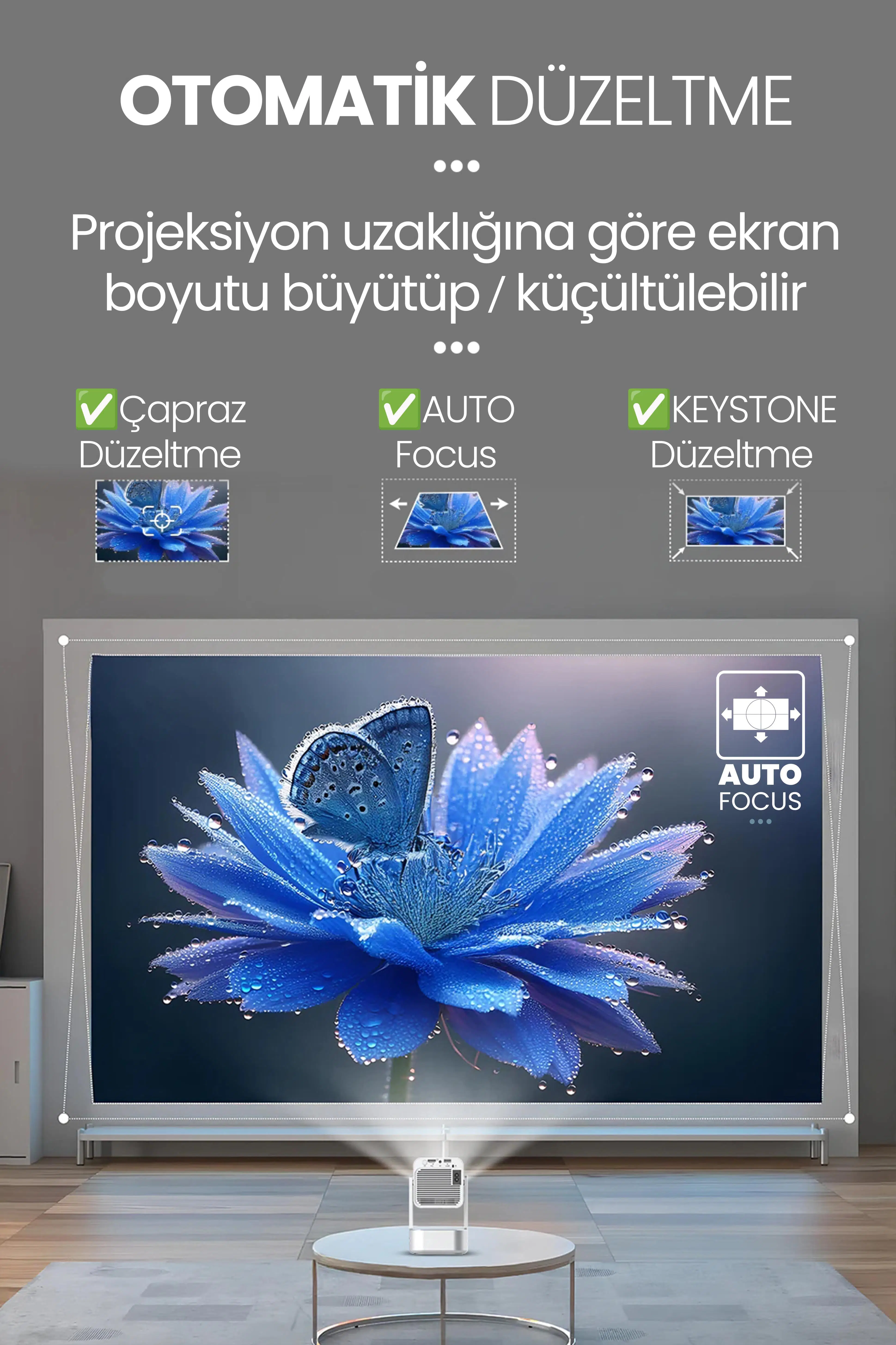 Evde sinema deneyimi yaşamak, oyun oynamak veya büyük ekranda içerik izlemek isteyen kullanıcılar için geliştirilen bu akıllı projeksiyon cihazı; kompakt yapısı, otomatik görüntü ayar teknolojileri ve güçlü bağlantı seçenekleri sayesinde pratik ve modern bir kullanım sunar. Küçük boyutuna rağmen geniş ekran deneyimi sağlayarak ev, ofis ve taşınabilir kullanım senaryolarına uyum sağlar.