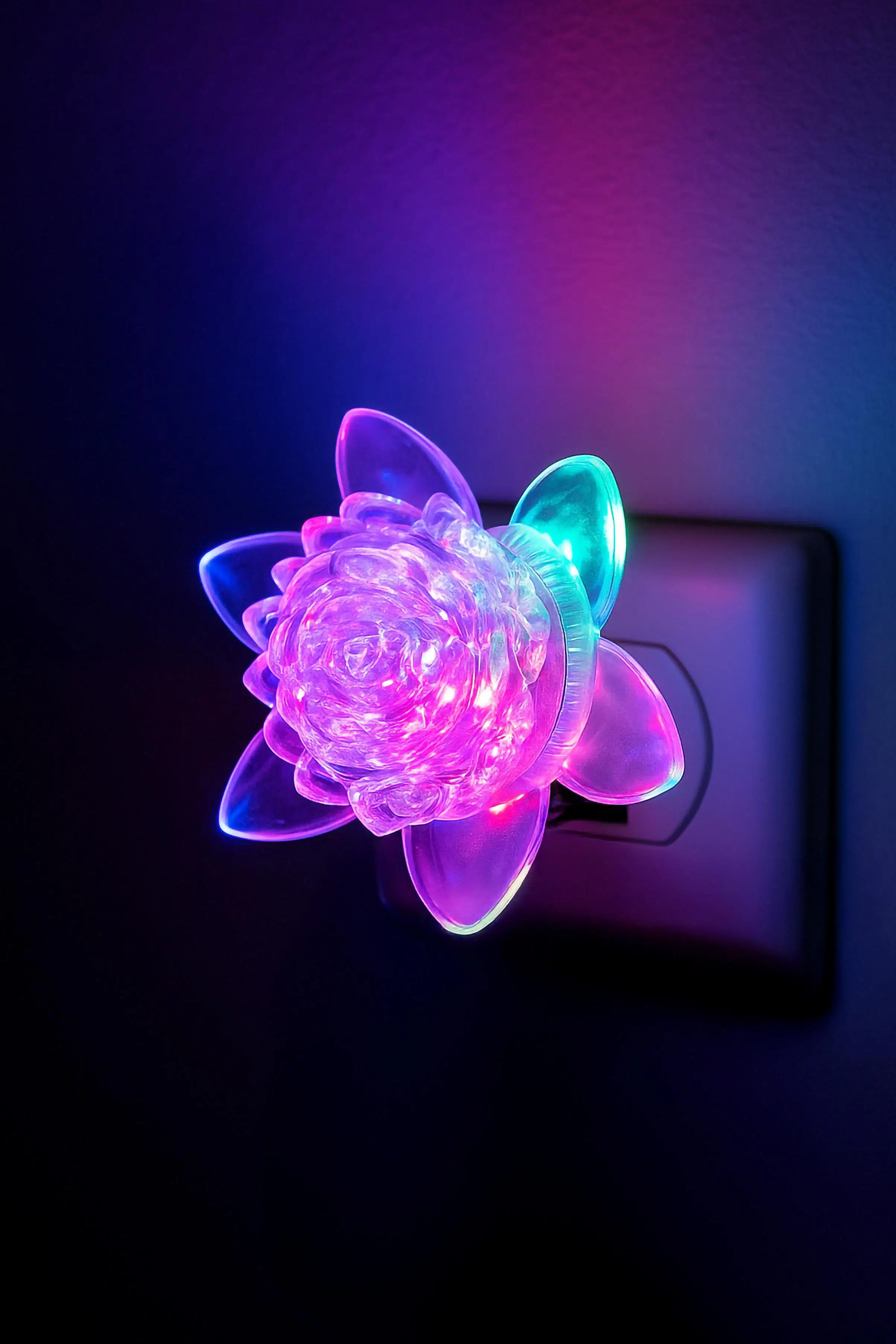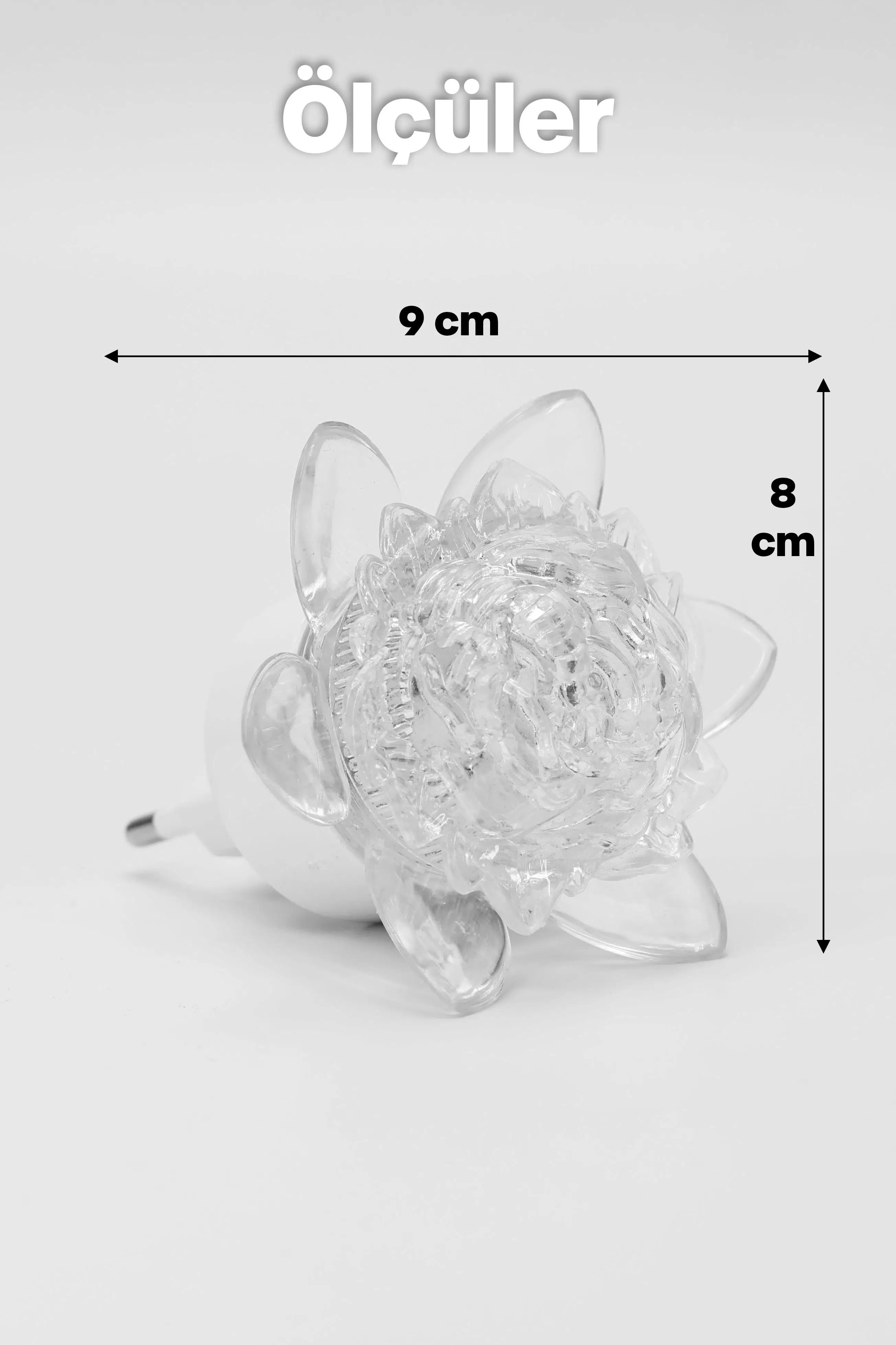 Evinizin her köşesine estetik bir dokunuş ve yumuşak bir aydınlatma kazandıran bu şeffaf çiçek tasarımlı gece lambası; RGB renkleri, düşük enerji tüketimi ve pratik kullanım özellikleriyle ideal bir gece ışığıdır. Direkt olarak duvar prizine takılır, aç/kapa anahtarı sayesinde kolayca kontrol edilir ve tüm yaşam alanlarında dekoratif bir ambiyans oluşturur.