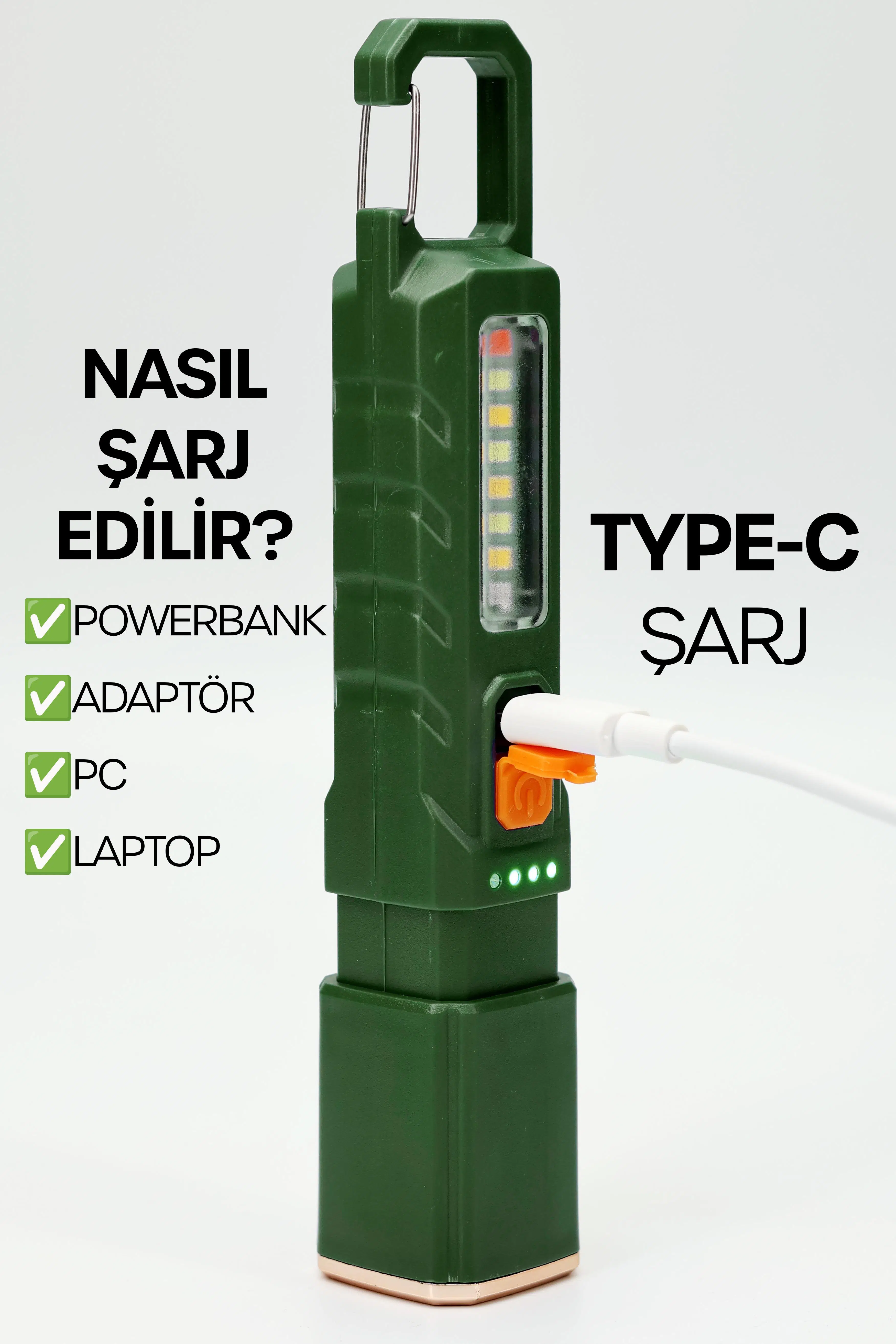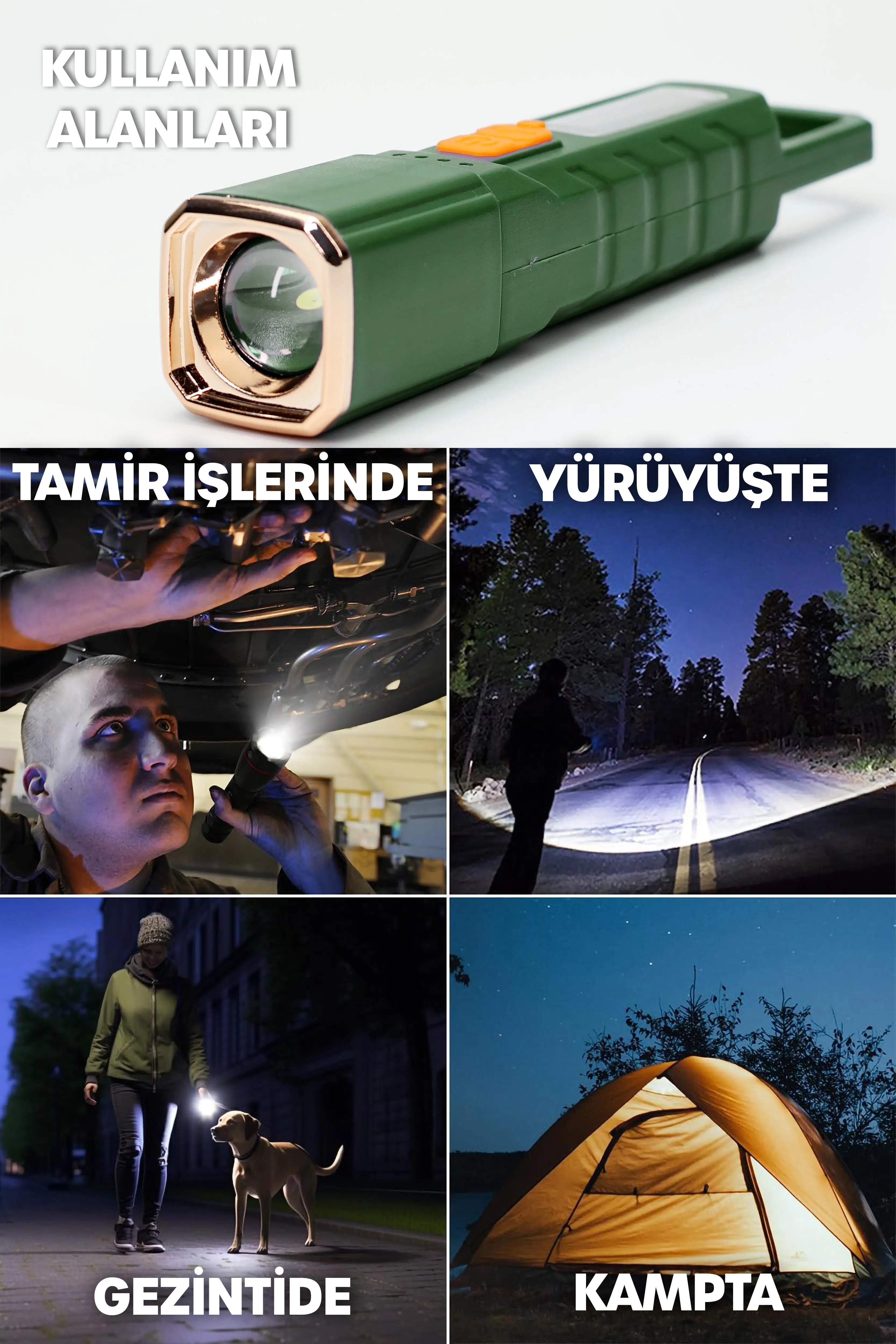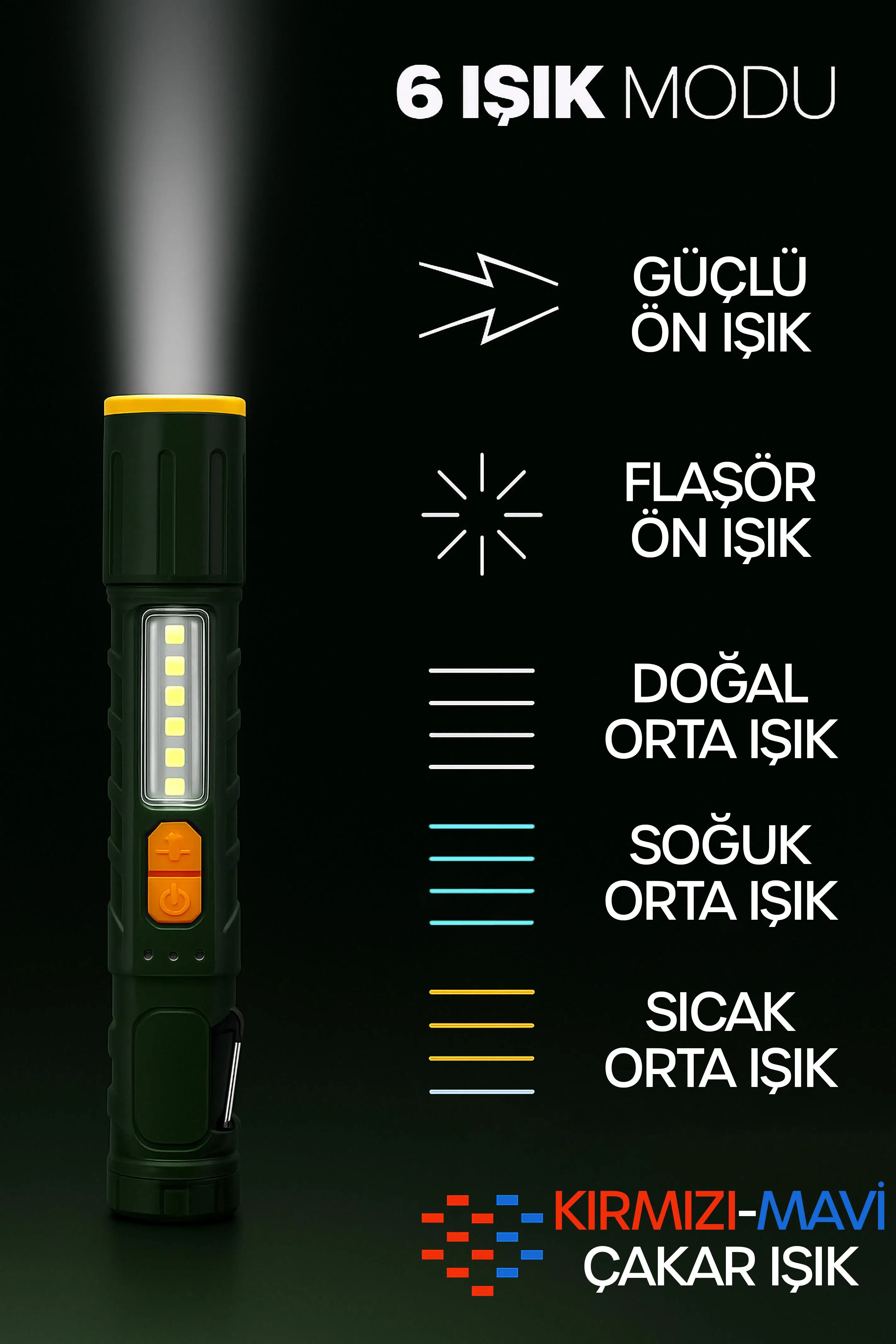 Bu çok fonksiyonlu şarjlı ışıldak, hem kamp hem de tamir, yürüyüş veya acil durumlarda kullanıma uygun, yüksek performanslı LED fener olarak tasarlanmıştır. Teleskopik zoom, Type-C şarj girişi, 6 farklı ışık modu ve çift taraflı aydınlatma özelliğiyle profesyonel kullanım sunar.
