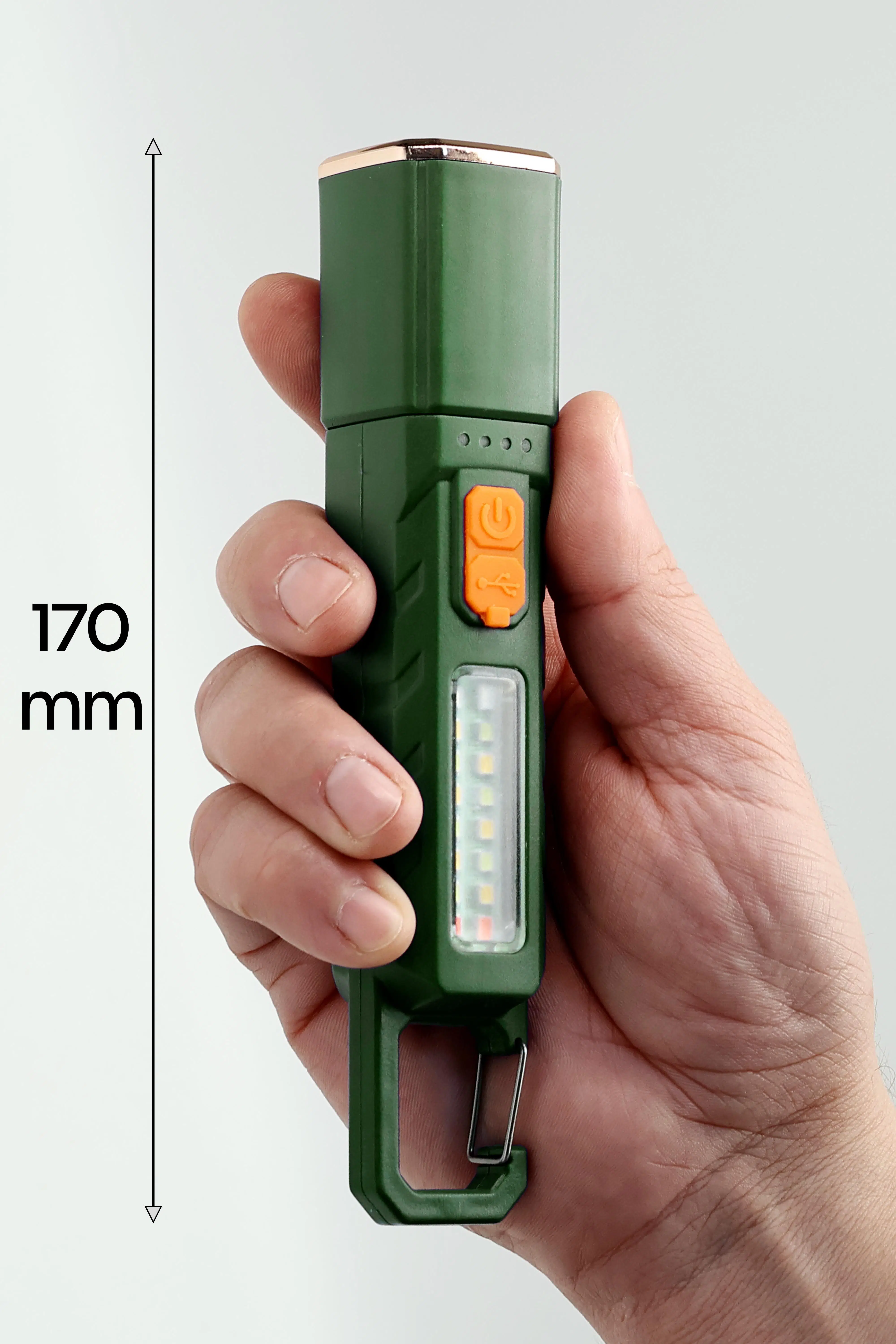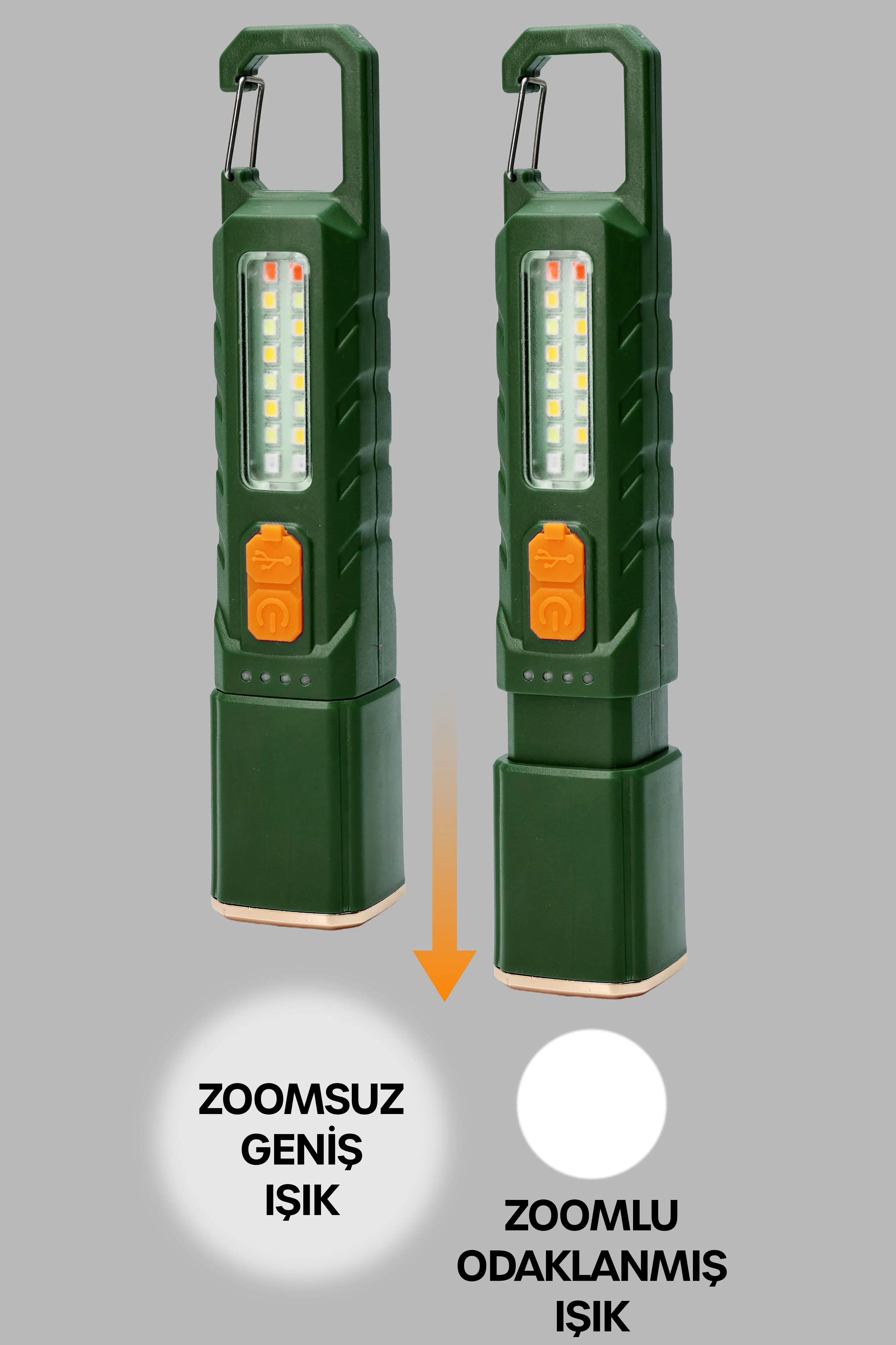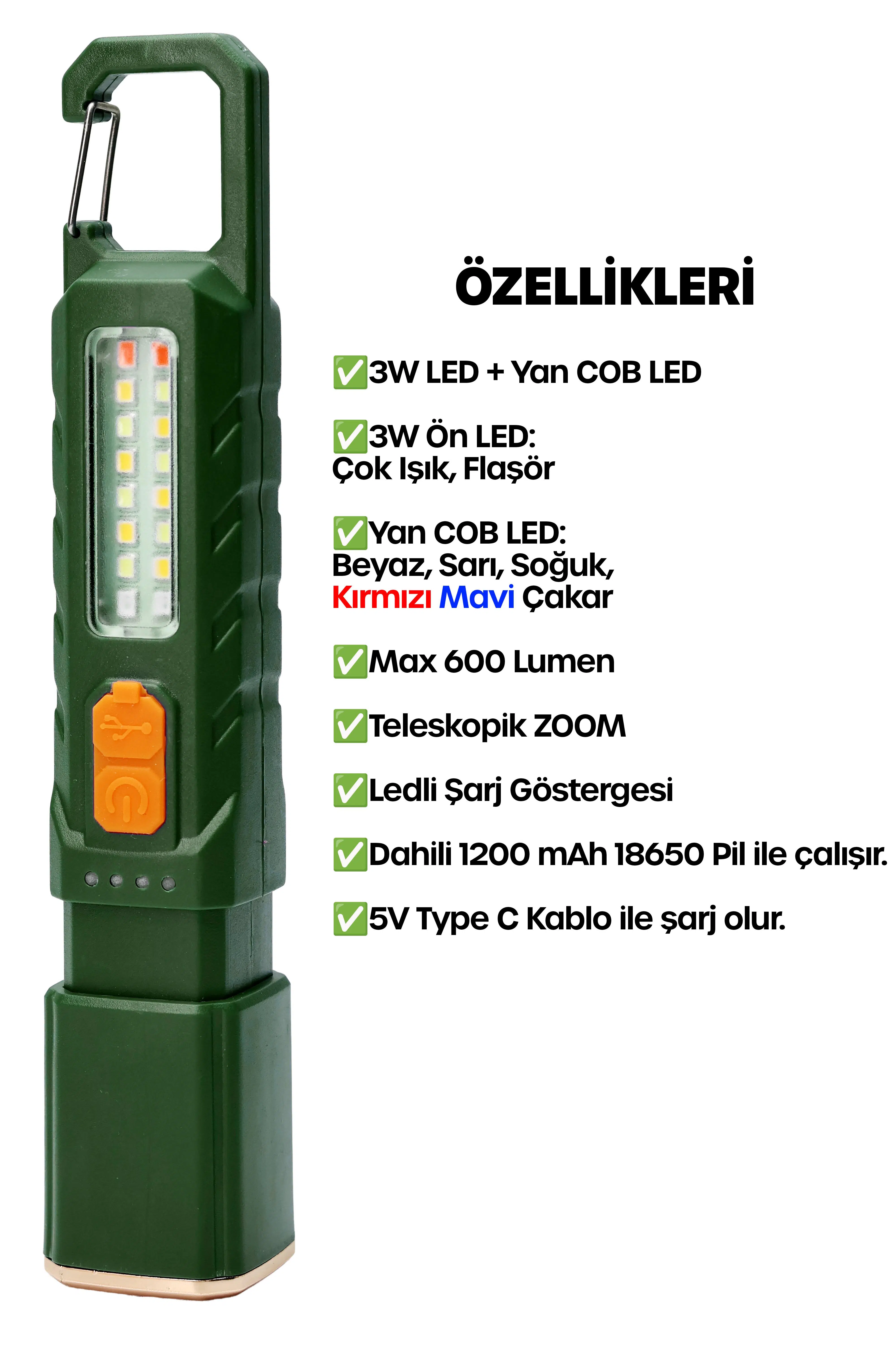 Bu çok fonksiyonlu şarjlı ışıldak, hem kamp hem de tamir, yürüyüş veya acil durumlarda kullanıma uygun, yüksek performanslı LED fener olarak tasarlanmıştır. Teleskopik zoom, Type-C şarj girişi, 6 farklı ışık modu ve çift taraflı aydınlatma özelliğiyle profesyonel kullanım sunar.