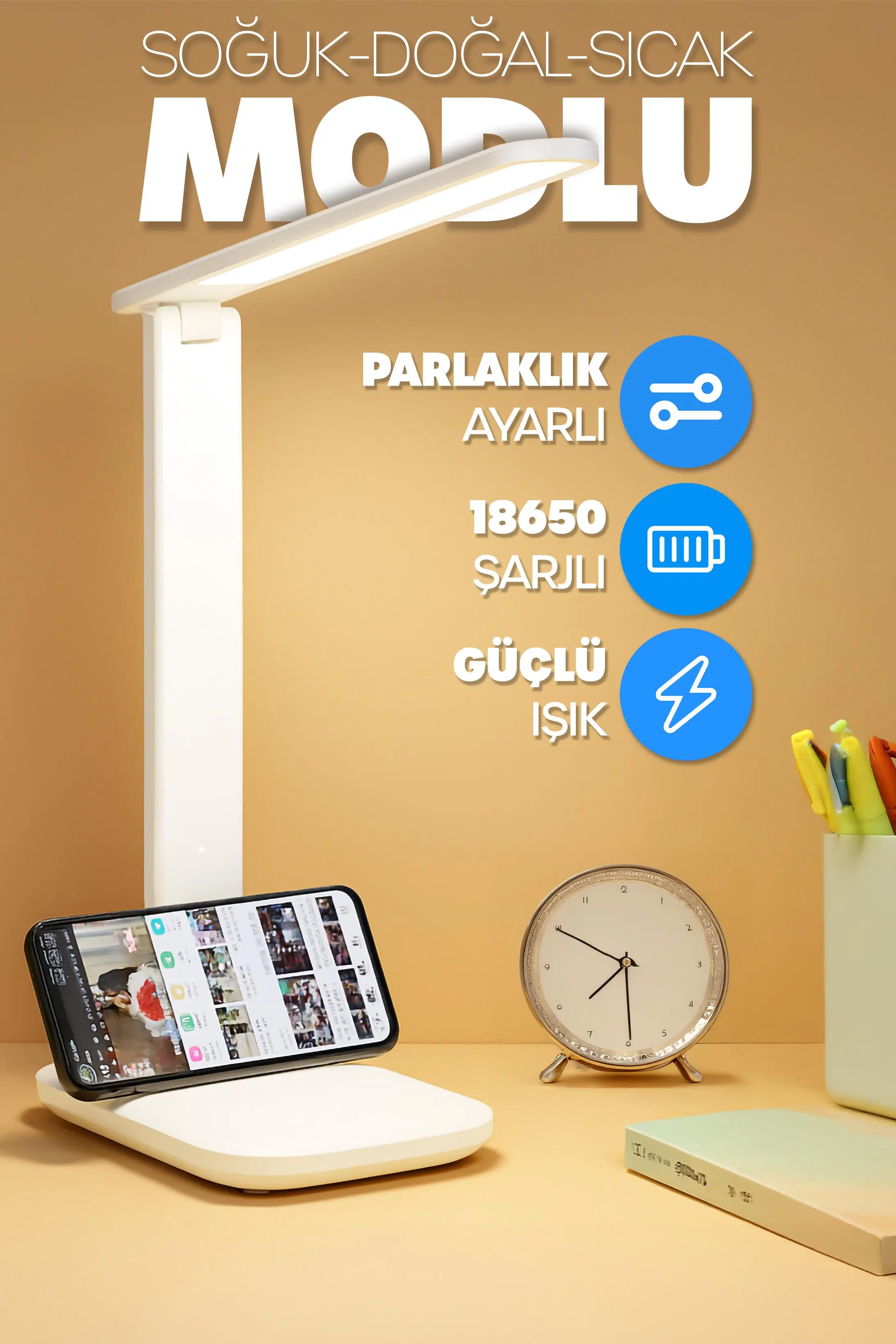 | Etiketler | Şarjlı Masa Lambası 3 Renk Dokunmatik Telefon Standlı Kademeli Çalışma Okuma Işığı Lambası 9W Beyaz |