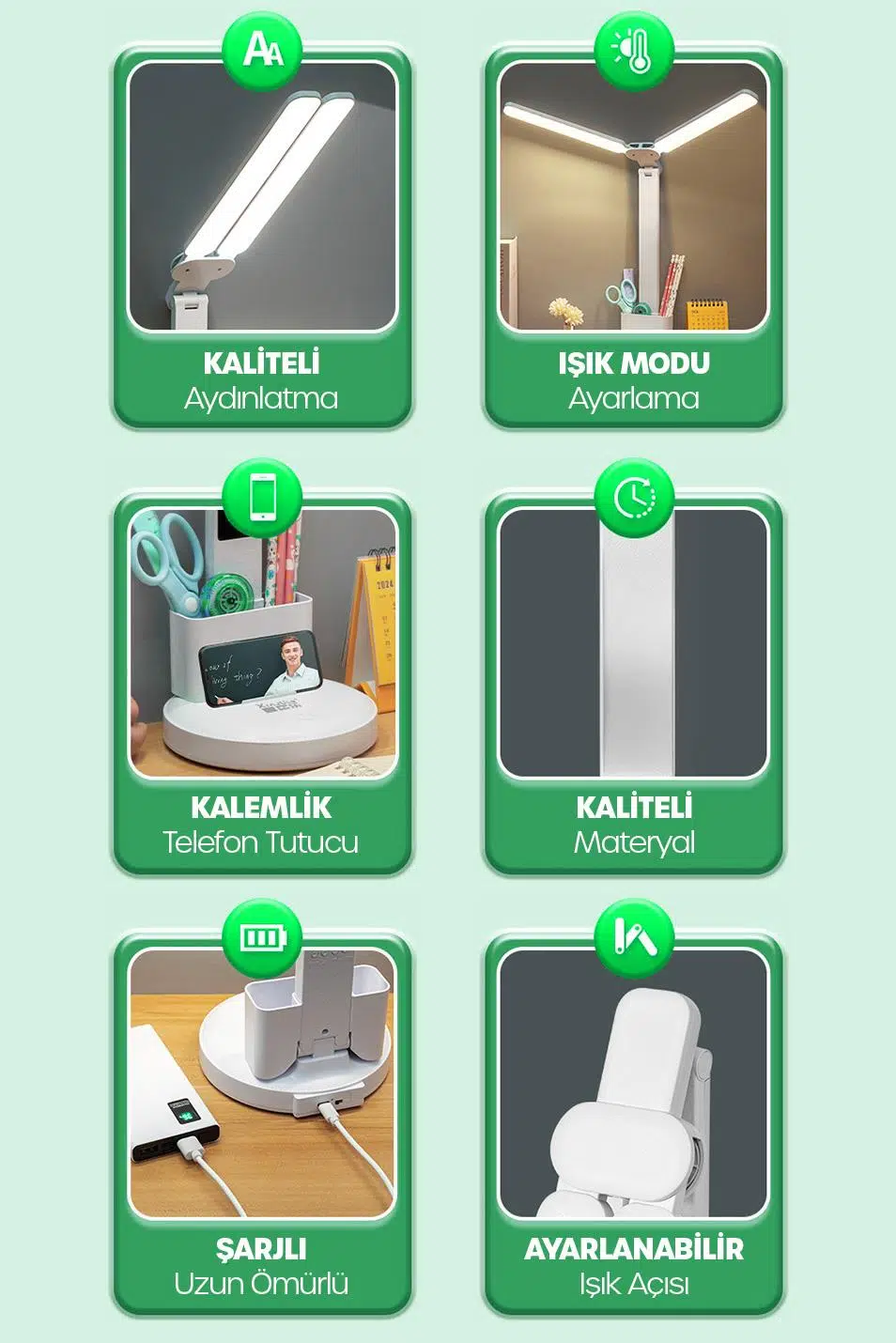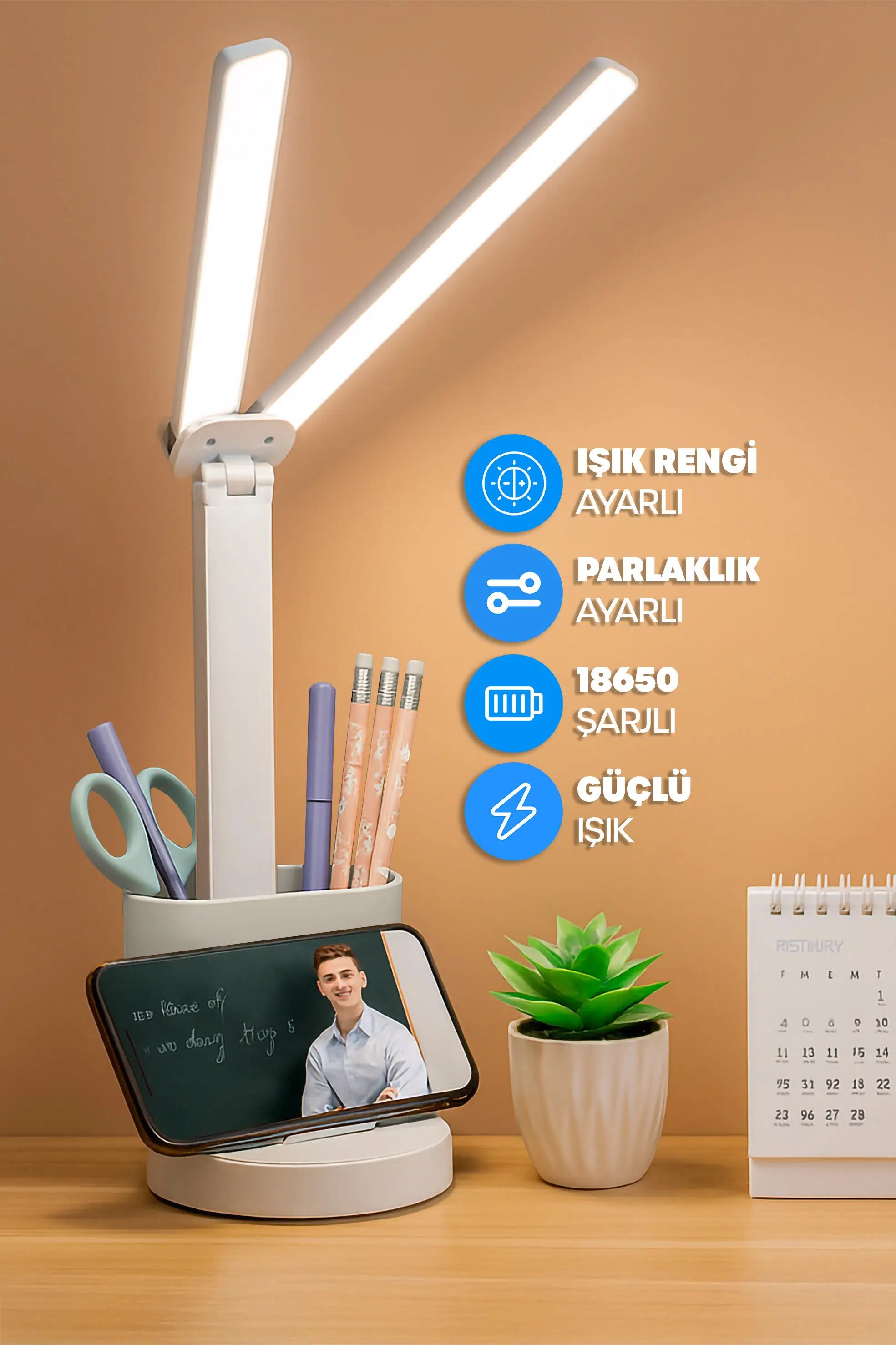 | Etiketler | Şarjlı Masa Lambası Çift Geniş Kafa Dimmerli Kalemlikli Telefon Standlı Ders Çalışma Işığı 0606-1 |