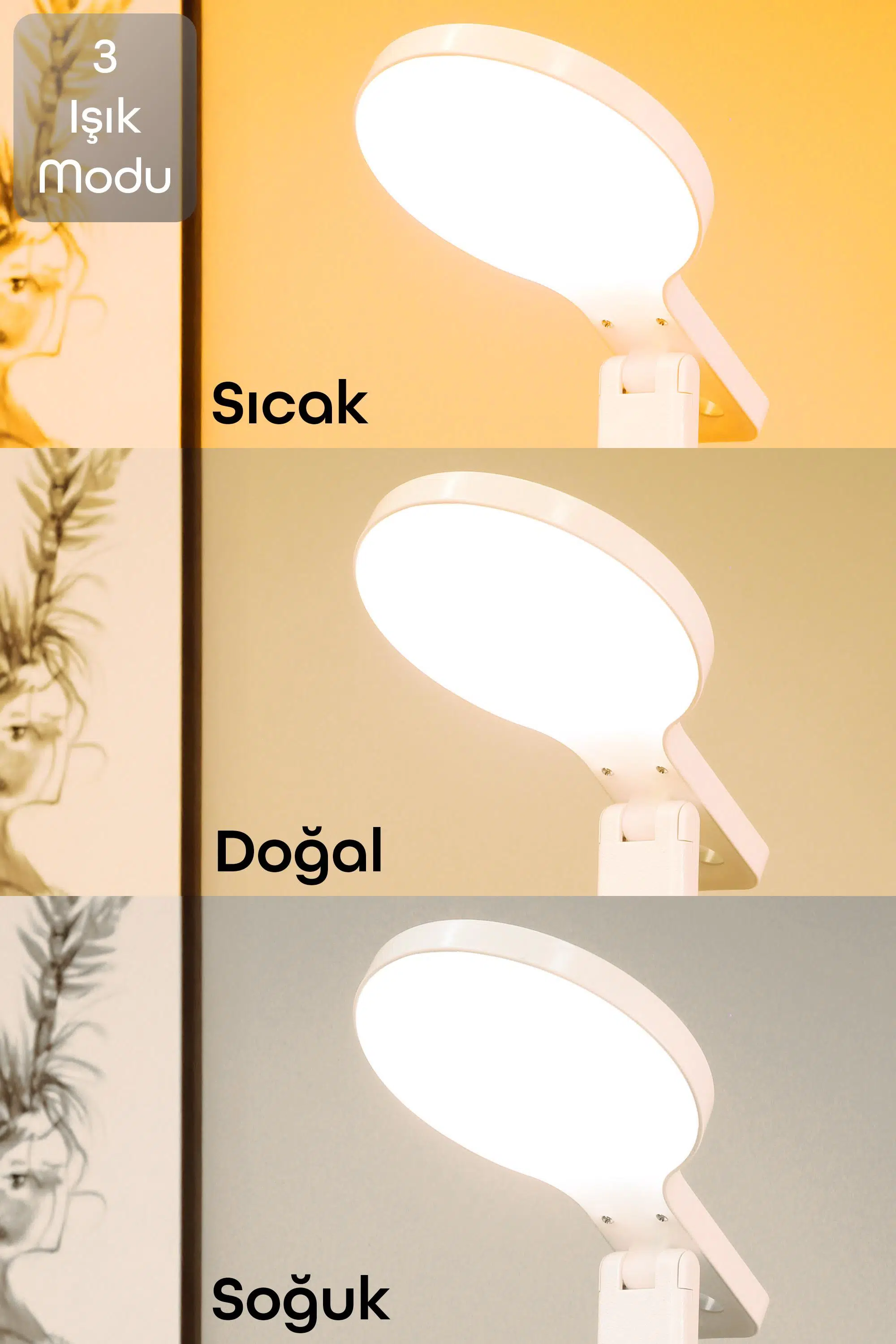 * **Üç Farklı Işık Modu:** Sıcak, doğal ve soğuk olmak üzere üç farklı ışık modu mevcuttur. Çalışma, okuma veya dinlenme için en uygun atmosferi yaratabilirsiniz.